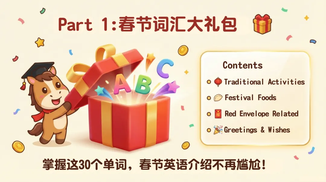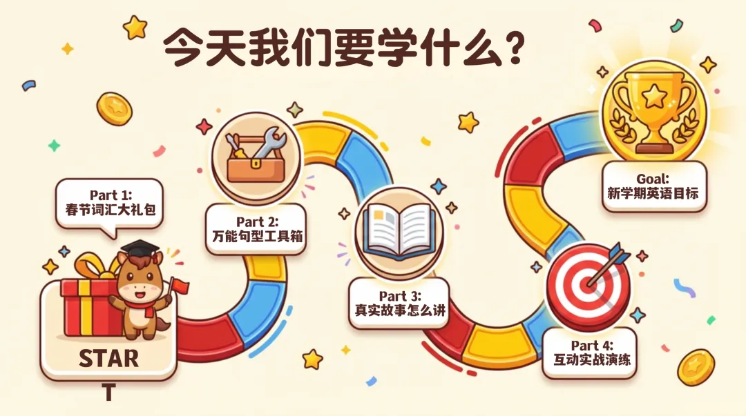 核心内容分为四大板块,还搭配新学期目标规划,实用性拉满:春节词汇大礼包整理了 30 个高频词