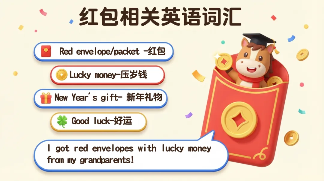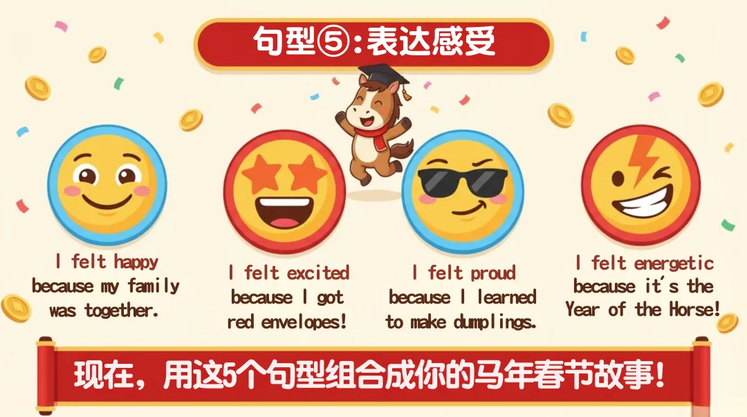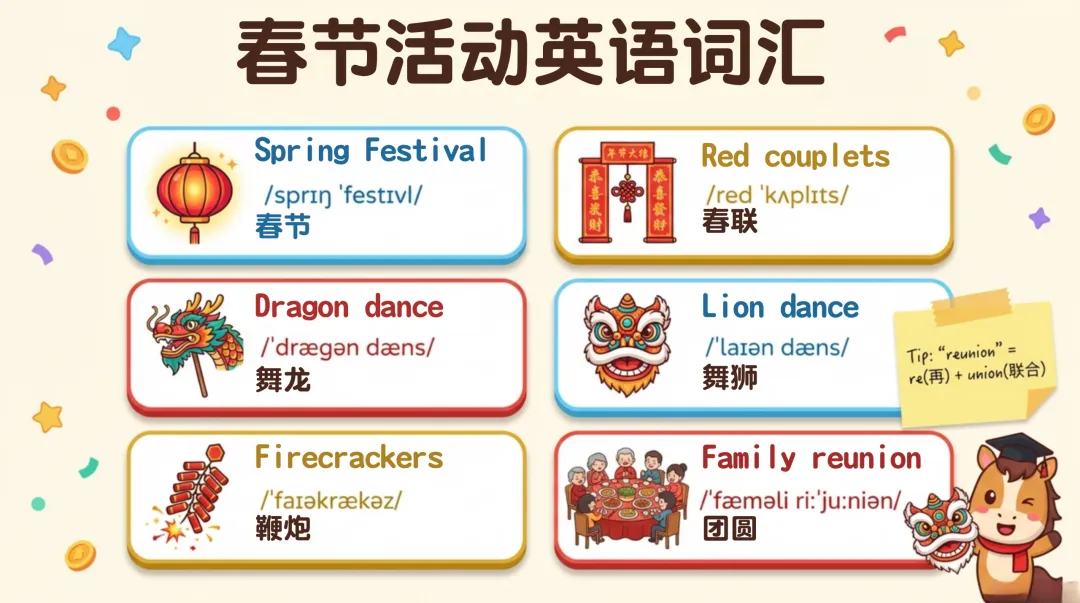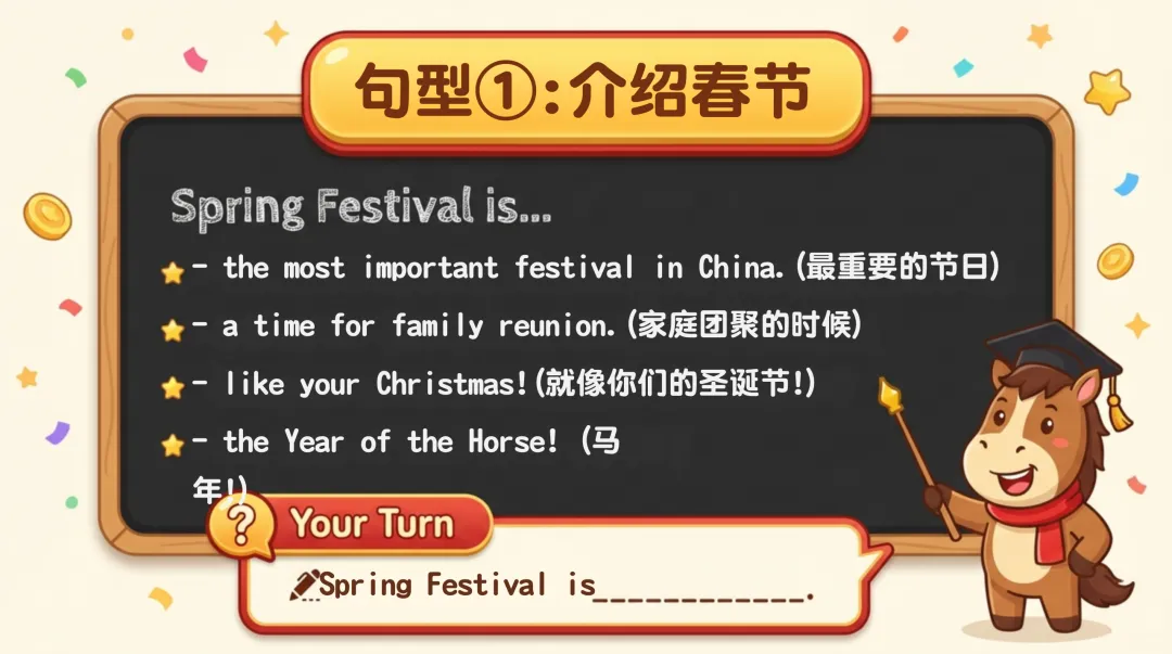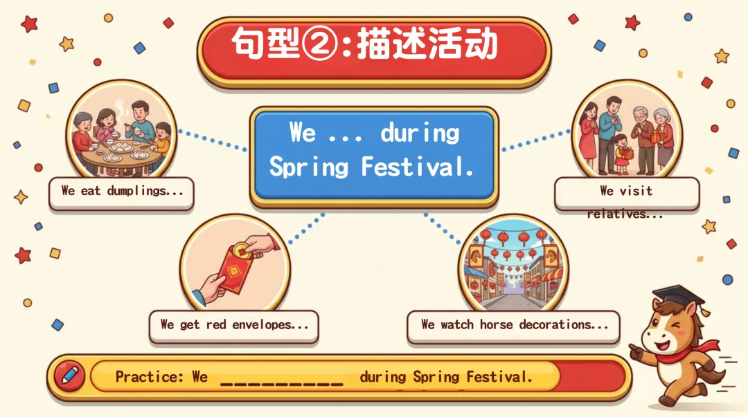 涵盖传统活动、节日美食、红包相关和新春祝福,精准解决学生表达卡壳问题;万能句型工具箱提炼 5 个核心句式,适配介绍、描述、讲故事等多种场景,让学生轻松搭建英语表达框架;
