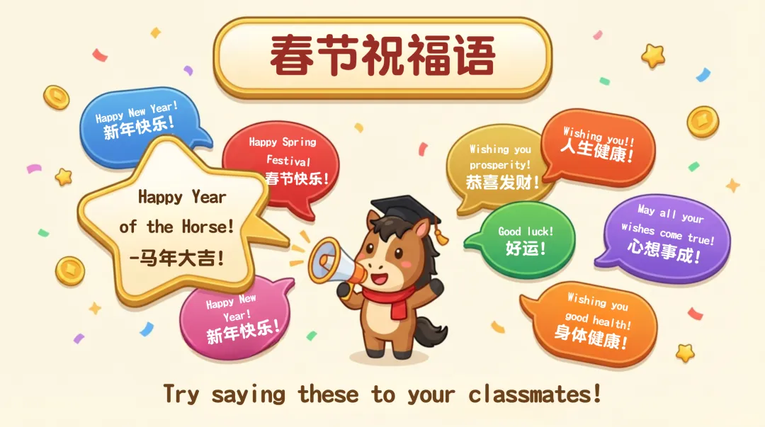 ppt 将 “马到成功” 等美好寓意与英语学习结合,既渗透传统文化教育,又树立学生新学期学习目标,让学生在趣味中学英语。