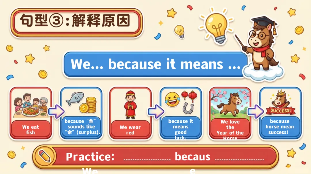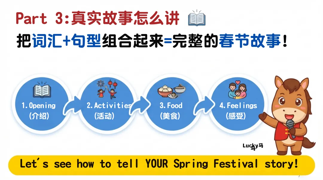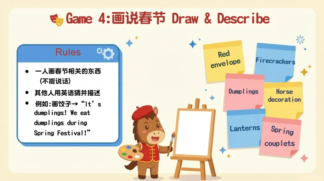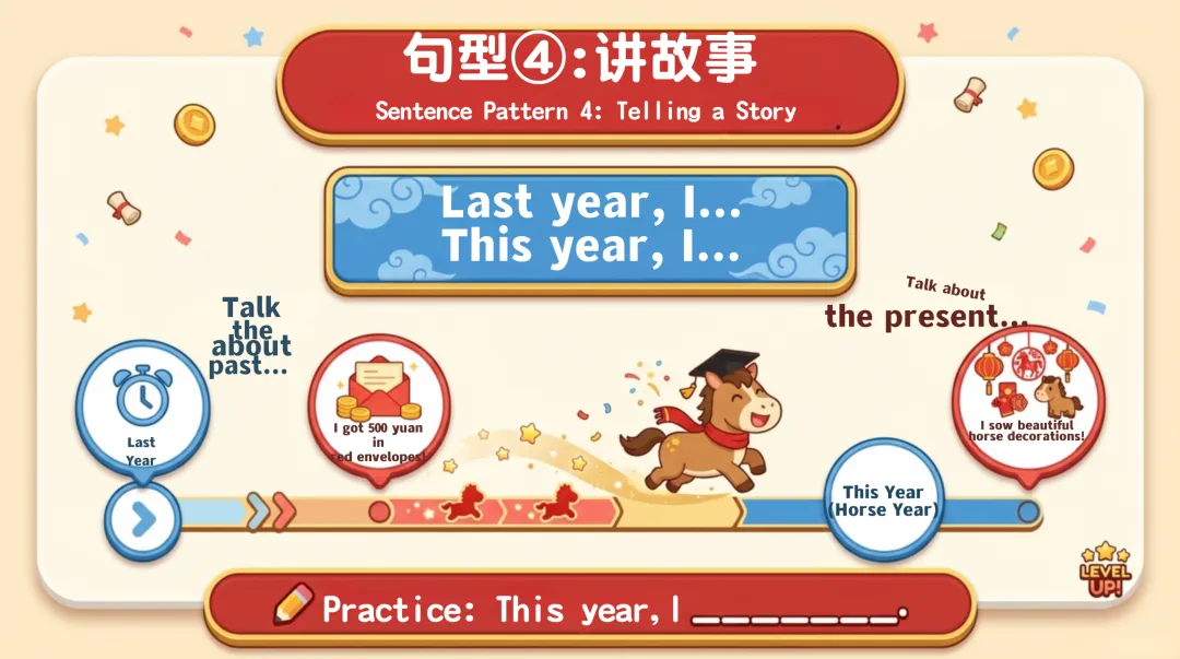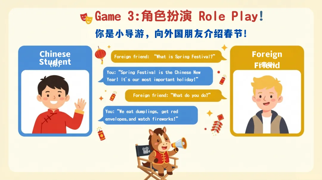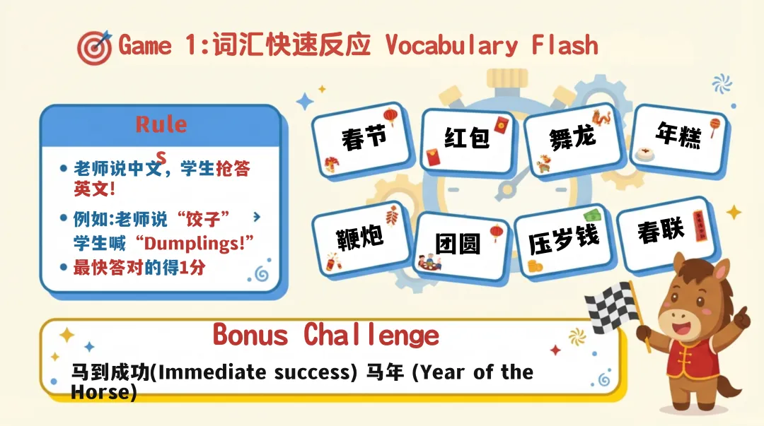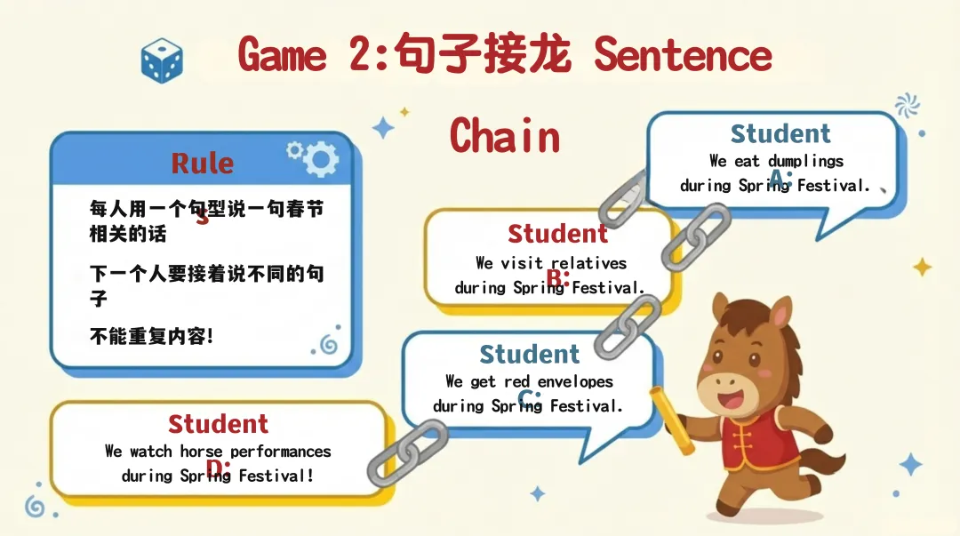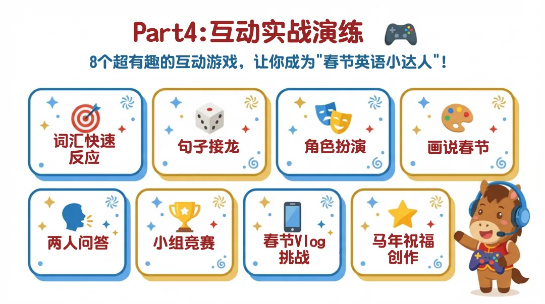 真实故事讲解环节给出完整示范和模板,教学生将词汇与句型结合,打造专属春节故事;8 个趣味互动游戏,从词汇抢答到角色扮演、Vlog 挑战,彻底激活课堂氛围,让学生在玩中投入学习模式。