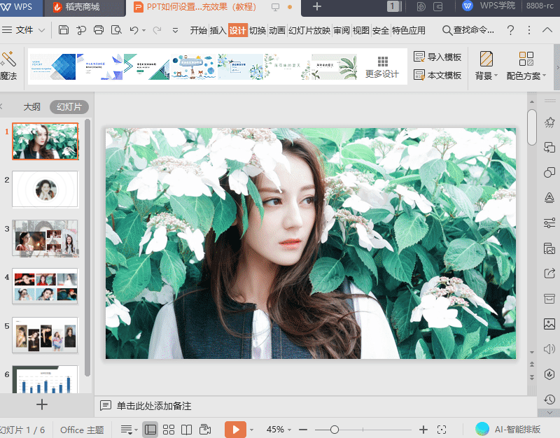 点击设计-配色方案,在弹窗中选择我们需要的方案,例如行云流水,