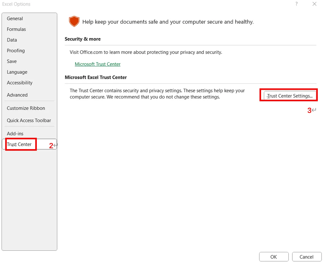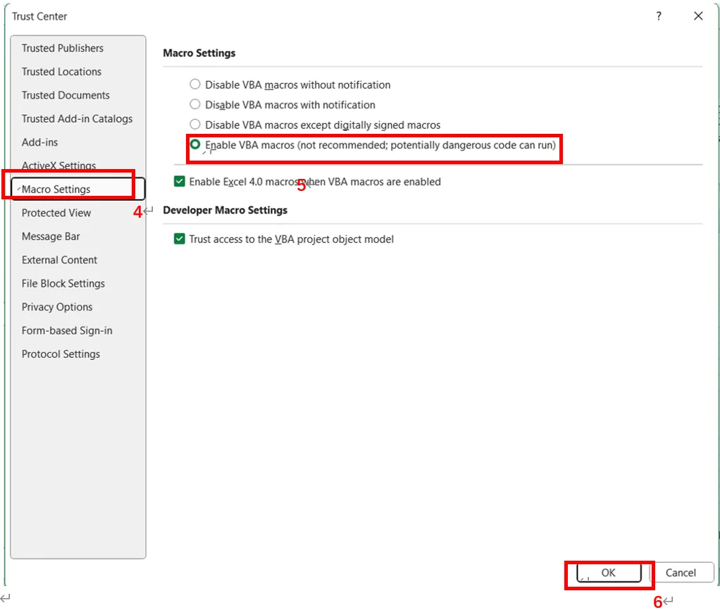 步骤:>File>Option>Trust Center>Trust Center Settings>Macro Settings>Enable VBA macros(not recommended;potentially dangerous code can run)>OK