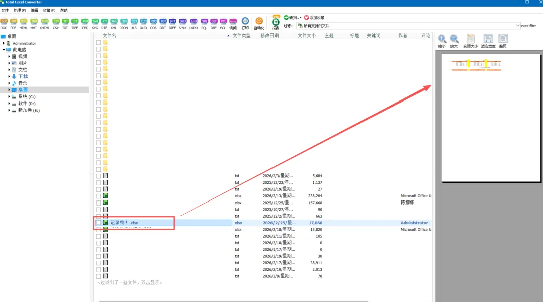 选择一个excel文档之后,右侧会有个窗口预览,可以设置一些页面的大小调整预览。工具上面一排,就是支持的转化的格式,这里我试试转成word弹出的窗口左侧,你可以自己根据需求自己配置,比如是否加水印,是否excel每个sheet都作为单独文件等等。
