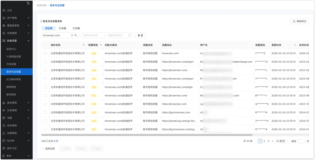 ● 敏感数据泄露监测: 实时监测明网、深网和暗网中可能存在的代码、凭证、密码、账号、目标用户信息和供应链组织信息的泄露。