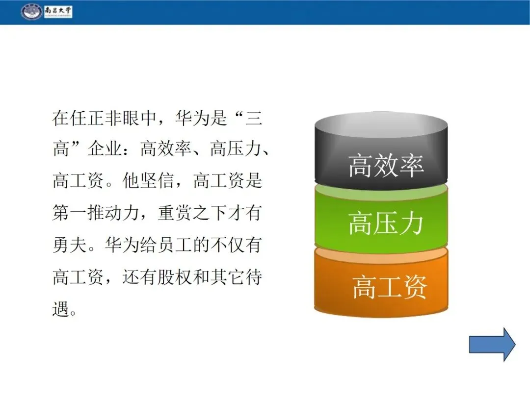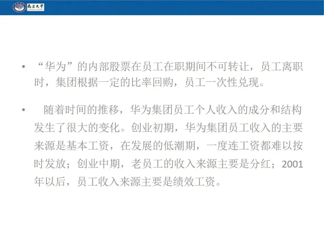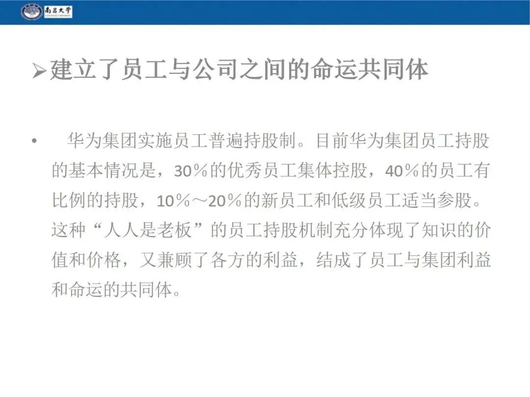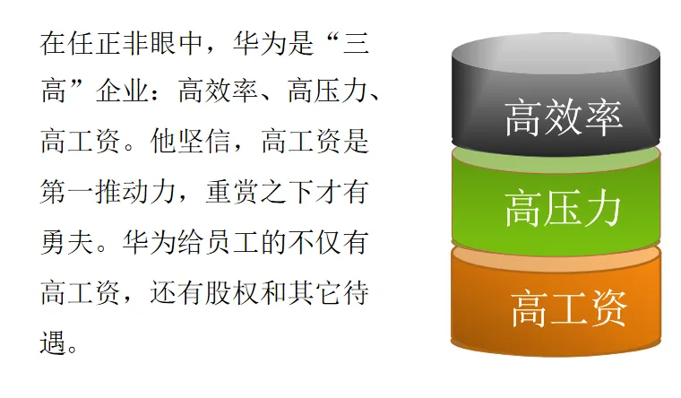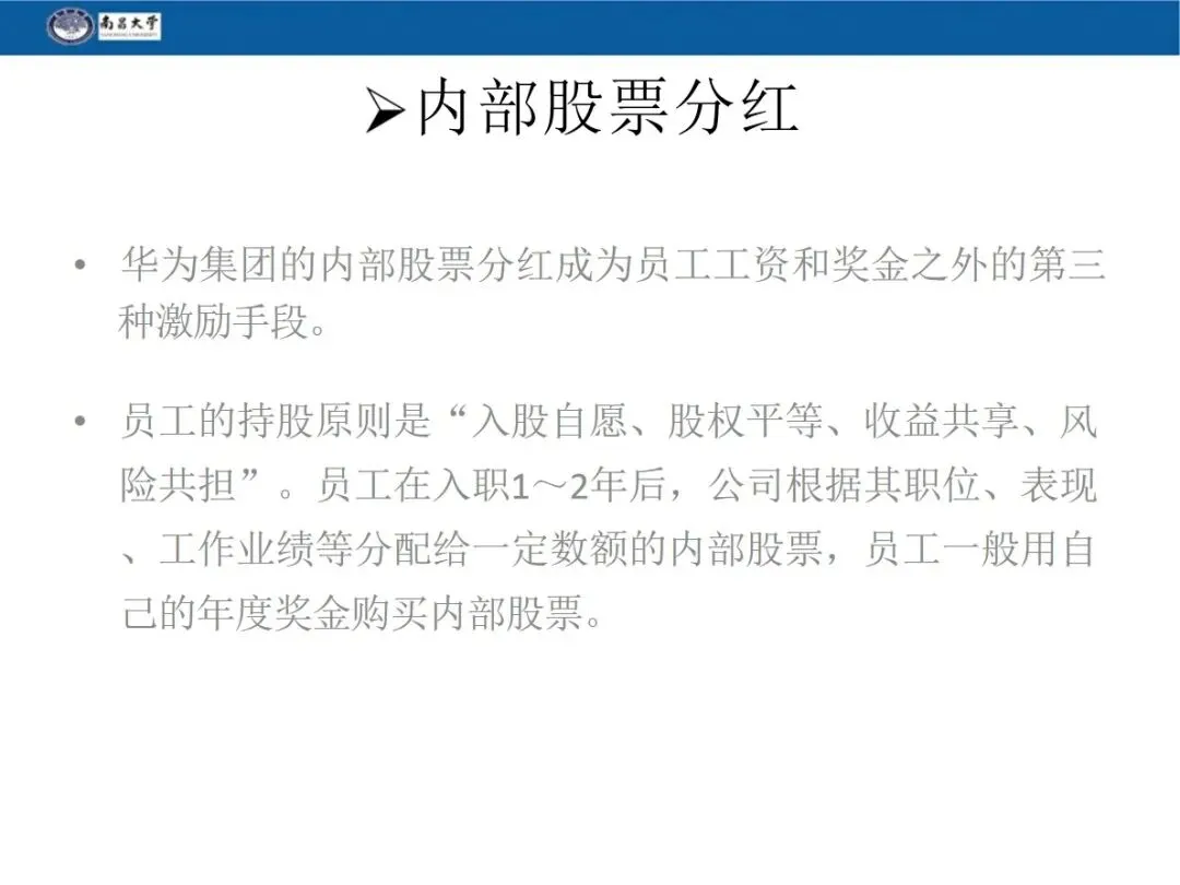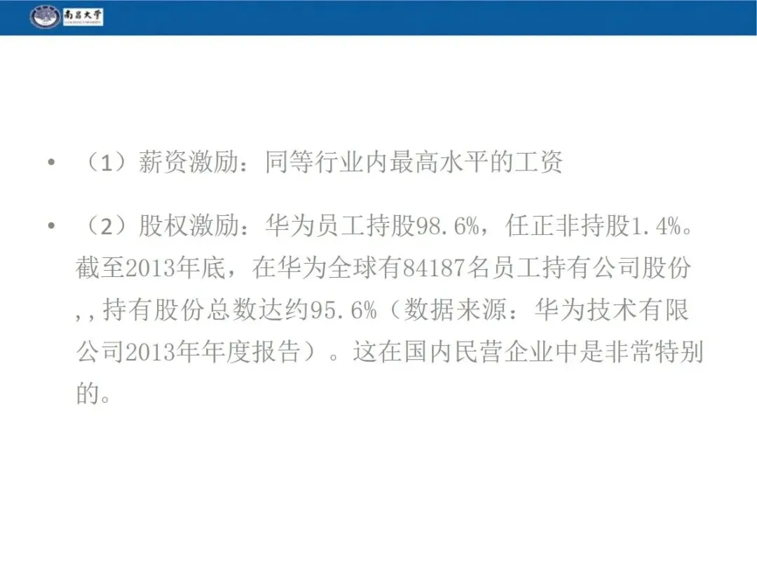 内部股权是华为重要的激励手段,员工入职 1-2 年后,公司会根据其职位、表现配给内部股票,员工一般用年终奖购买,在职期间不可转让,离职时由公司回购。华为 98.6% 的股权由员工持有,任正非仅持股 1.4%,打造出员工与企业的利益命运共同体。