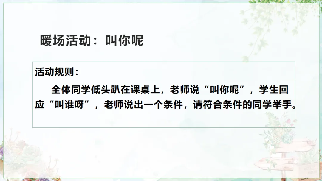呈现活动规则:全体同学低头趴在课桌上,老师说“叫你呢”,学生回应“叫谁呀”,老师说出一个条件,请符合条件的同学举手。