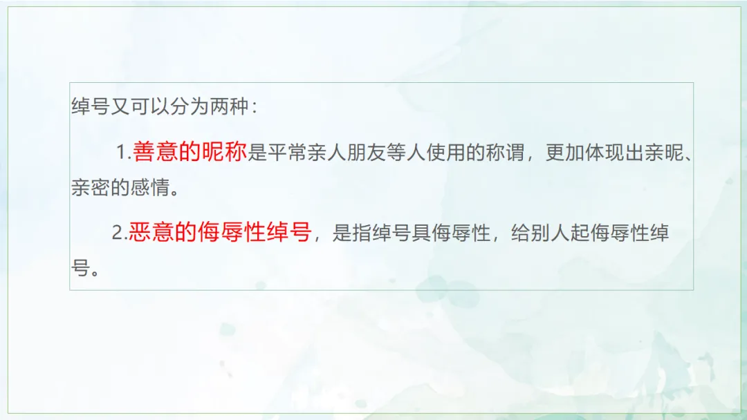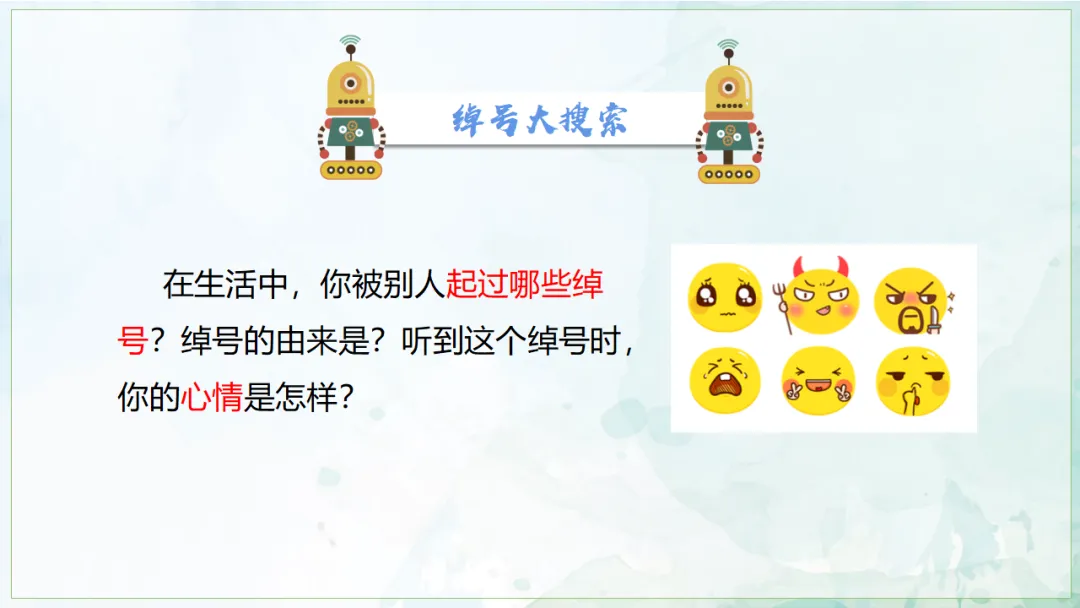 教师小结:在同学们的分享中,我们会发现面对不同的绰号会有不同的情绪反应。有的绰号让人感受到愉悦,有的绰号让人感受到羞耻,其实绰号可以分为两类:善意的昵称和侮辱性绰号。
