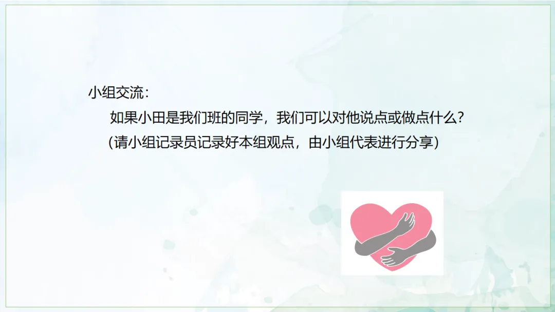 小组交流:如果小田是我们班的同学,我们可以对他说点或做点什么?(请小组记录员记录好本组观点,由小组代表进行分享)