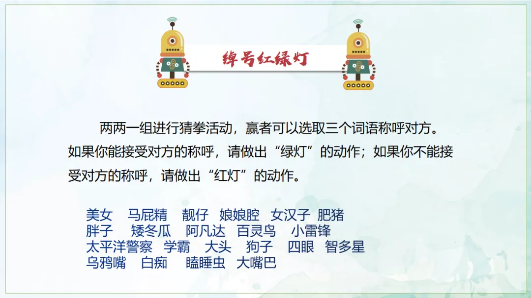 两两一组进行猜拳活动,赢者可以选取三个词语称呼对方。如果你能接受对方的称呼请做出“绿灯”的动作;如果你不能接受对方的称呼请做出“红灯”的动作。