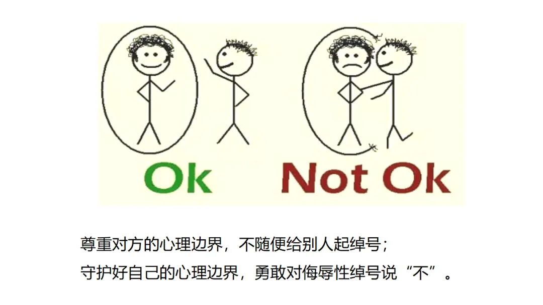 教师总结:绰号里的善与恶是对于被起绰号者而言,其实每个人都有自己的心理边界。尊重对方的心理边界,不随便给别人起绰号;守护好自己的心理边界,勇敢对侮辱性绰号说“不”。美国心理学家丹尼尔·戈尔曼所说:“你让人舒服的程度,决定着你所能抵达的高度。”在与人交往中,希望同学们在生活中,尊重对方的边界,要让别人因为你的存在而感到幸福。