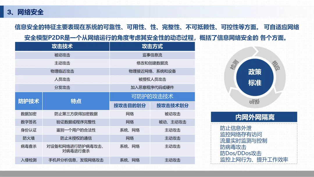 本方案围绕智慧电力建设目标,提出涵盖发电、输电、变电、配电、用电、调度六大环节的一体化解决方案,旨在通过数字化、智能化手段推动电力行业转型升级。发展背景与意义:智能电网被公认为未来电网发展的最佳路径,已成为欧美国家战略重点。我国面临能源结构优化、节能减排压力,发展智能电网是打通新能源瓶颈、实现低碳经济的关键举措。通过建设坚强智能电网,可提高资源配置能力、应对资源环境挑战、适应发用电多样化需求、满足多元化用电服务。国家政策与阶段规划:智能电网建设分三个阶段推进——2009-2010年规划试点,制定标准与技术研发;2011-2015年全面建设,加快特高压与配网建设;2016-2020年引领提升,全面建成统一坚强智能电网,清洁能源装机达35%,实现分布式电源“即插即用”。投资规模预计达4万亿元,带动特高压设备、智能电表、配电自动化、充电设施等产业链发展。信息化建设:方案聚焦五大核心能力——信息共享层面,构建IP呼叫中心、智能视频监控、AMI系统、应急指挥ECV快速部署,实现多媒体可视化调度与电能质量提升;高效存储方面,通过单板级与网元级备份确保系统99.999%可用性;网络安全层面,采用P2DR动态安全模型,实现内外网隔离、防病毒攻击、流量实时监测;运营管理方面,以客户为中心构建RFID、信息服务系统,实现内外兼顾的客户关系管理;监控管理层面,建立统一运维门户,实现对服务器、存储、网络、动力环境、虚拟化资源的集中监控,保障SCADA数据精准及时。核心优势:方案突出“简单、自适应、集成、安全”四大特点。支持手机级便捷操作,多终端自适应展示,集成各类应用至统一移动平台,采用SSL加密、密码MD5、短信验证等多重安全机制,确保终端、传输、应用全链路安全。同时提供专业实施服务、快速响应客户服务、持续迭代更新服务。
