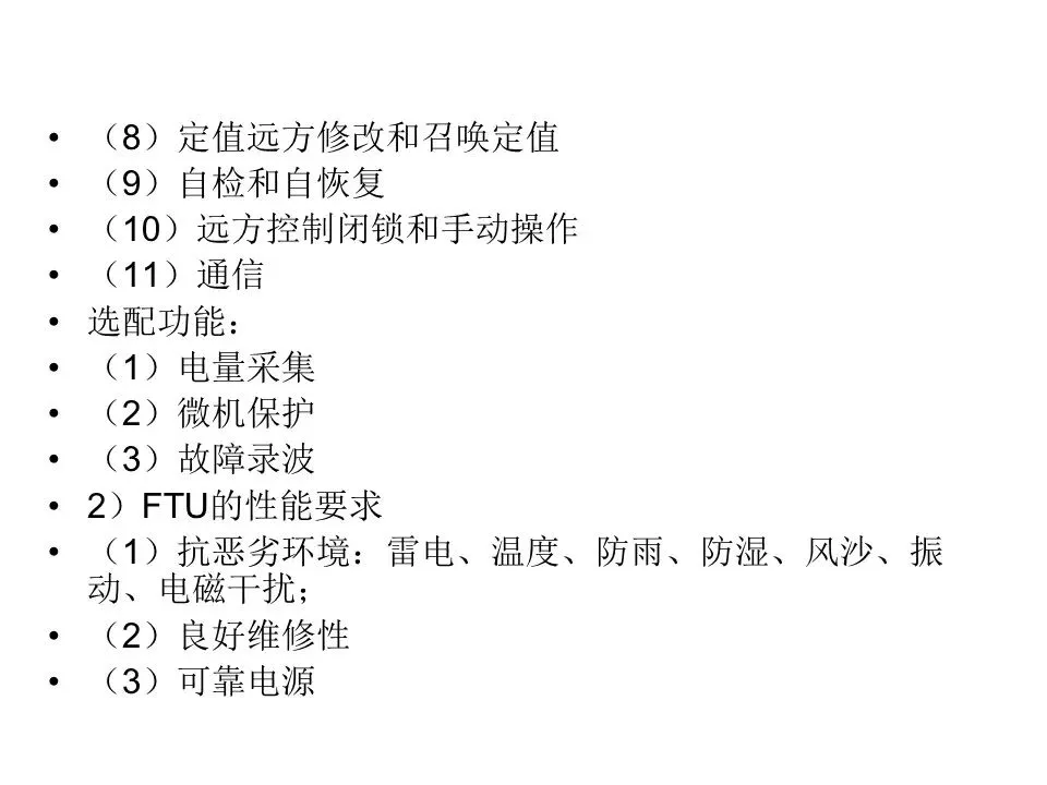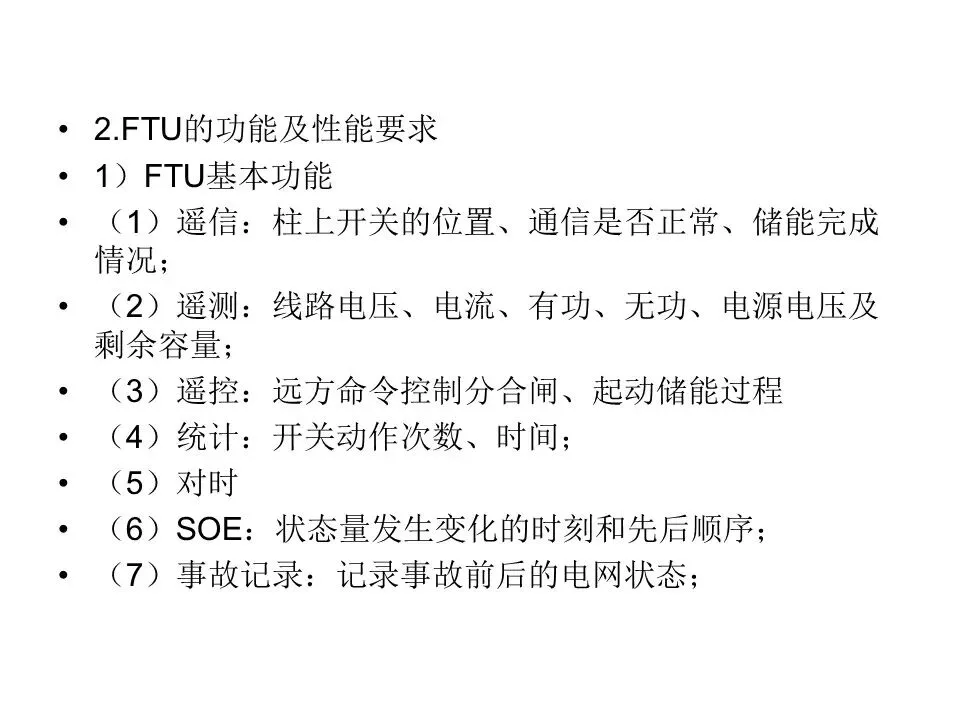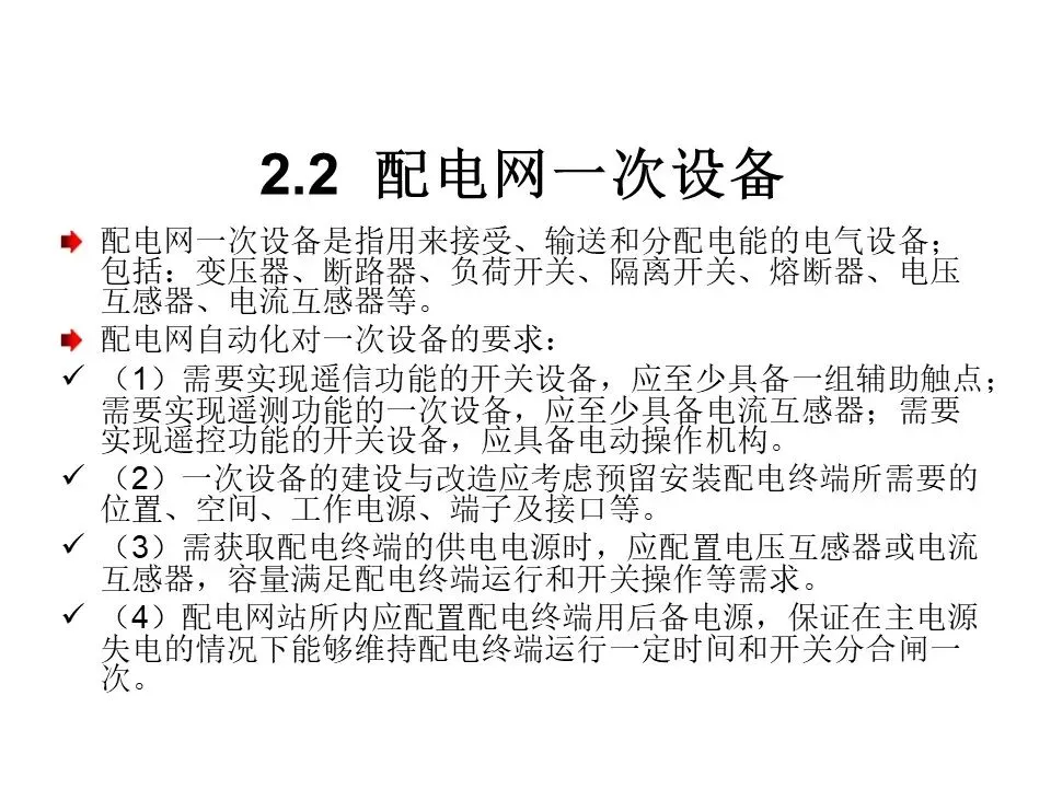 √(1)需要实现遥信功能的开关设备,应至少具备一组辅助触点;需要实现遥测功能的一次设备,应至少县备电流互感器:需要实现遥控功能的开关设备,应具备电动操作机构。