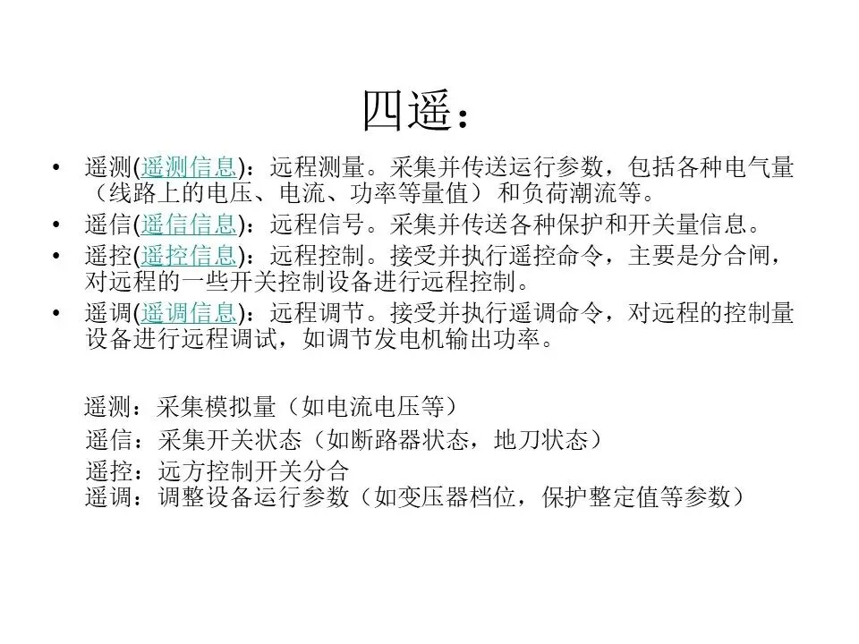 ·遥测(遥测信息):远程测量。采集并传送运行参数,包括各种电气量