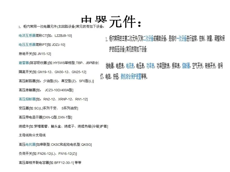 配电网一次设备是指用来接受、输送和分配电能的电气设备:包括:变压器、断路器、负荷开关、隔离开关、熔断器、电压互感器、电流互感器等。