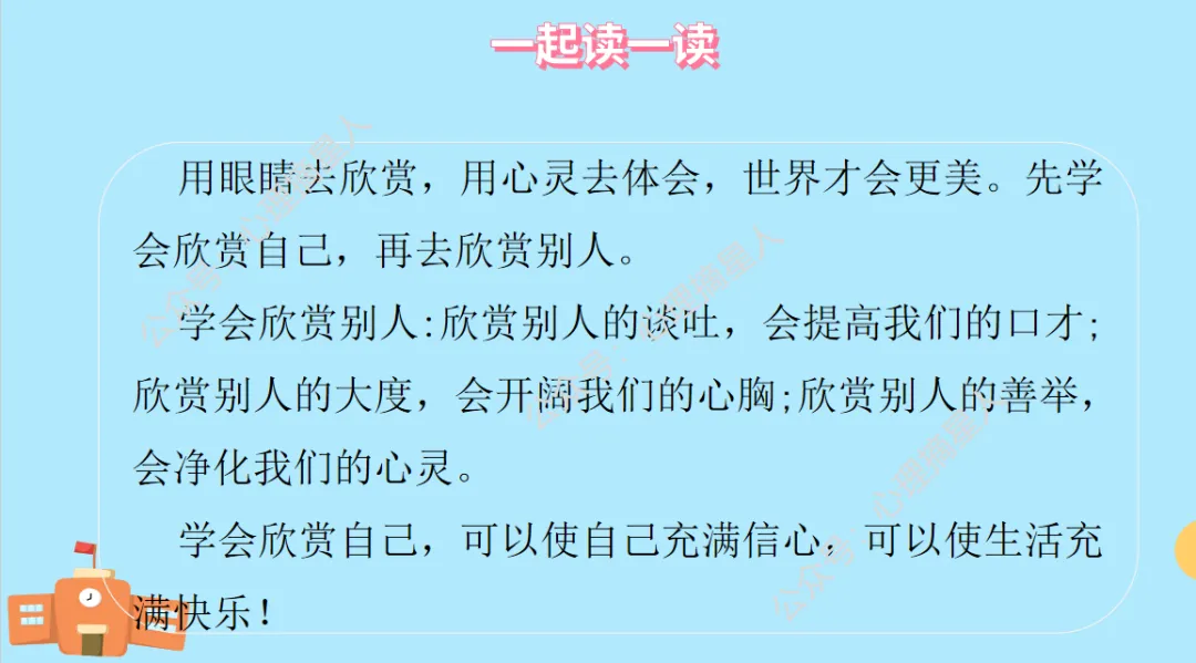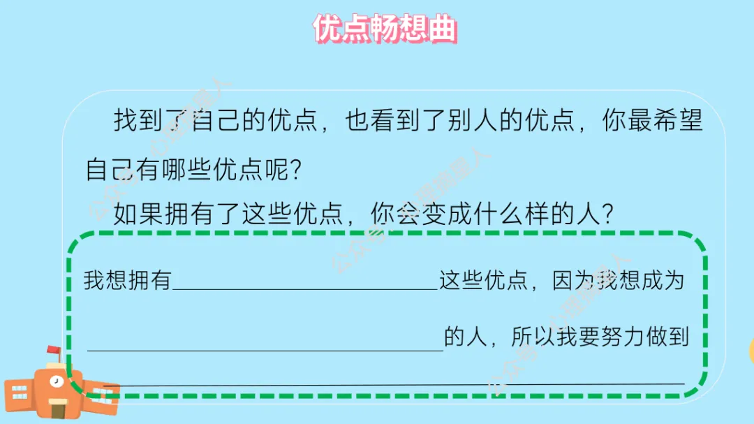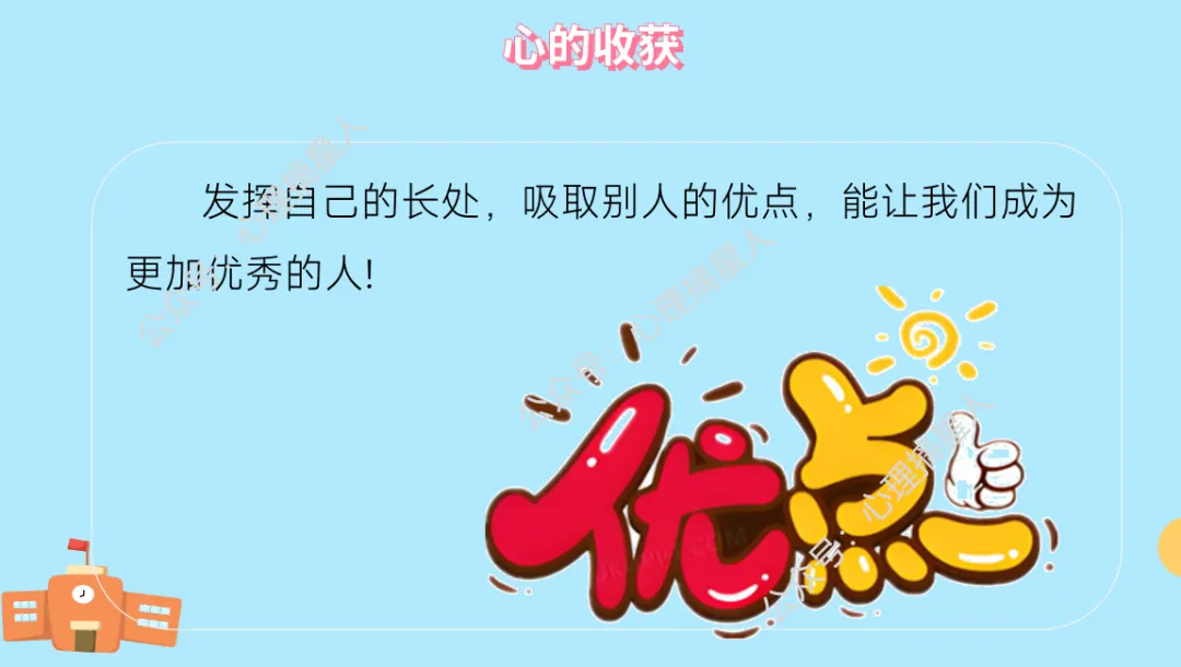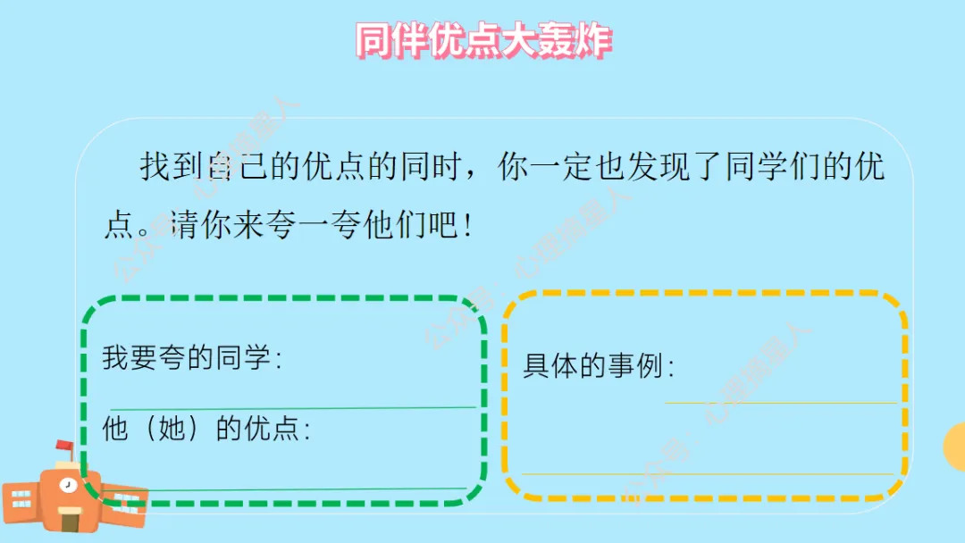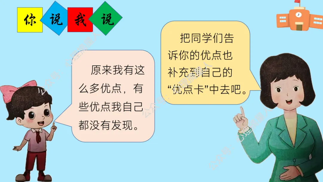 这个环节一来培养学生关注他人,在他人身上寻找优点的能力;二来也通过优点轰炸的形式,让自己认识到:“原来我们都有这么多优点,只是有些优点我们自己都没有发现。”
