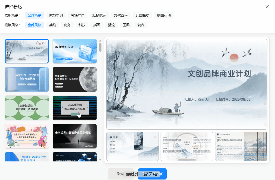 接着点击右下角的「更多模板」按钮,进入模板库选择一个合适的模板。这里的模板覆盖了商务汇报、教学备课、学术答辩、产品发布等常见场景,都非常实用。