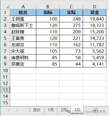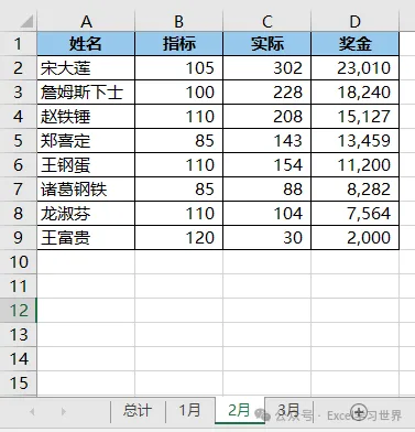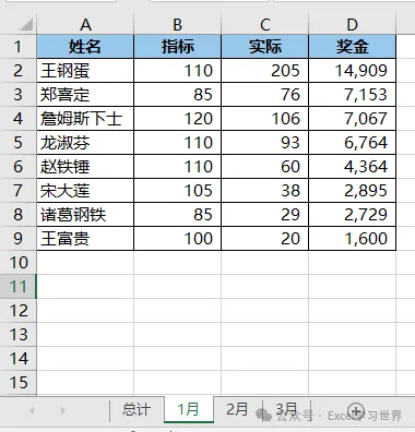 下图 1 至 3 分别是每个月的奖金计算表,每个表中的姓名排序都不一致。
