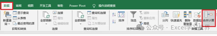 1. 选中“总计”工作表中的 A1 单元格 --> 选择工具栏的“数据”--> 选择“数据工具”区域的“合并计算”