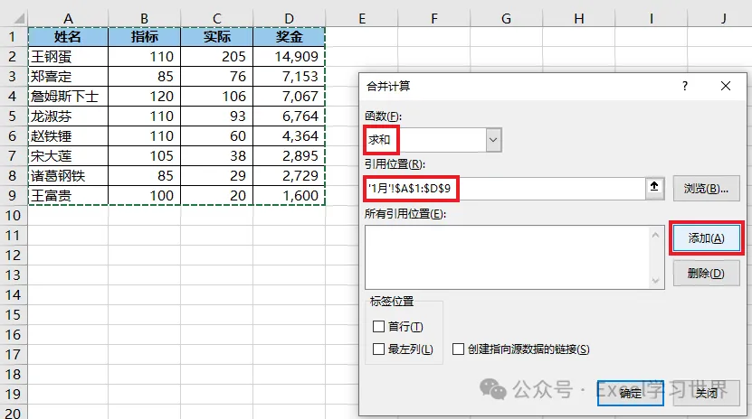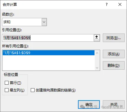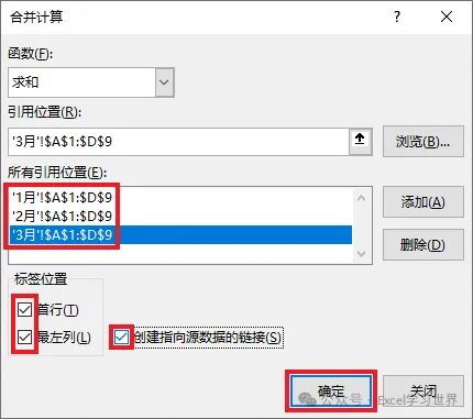 3. 重复上述步骤将每个月的数据表都添加到引用位置 --> 勾选“标签位置”中的所有选项 --> 点击“确定”