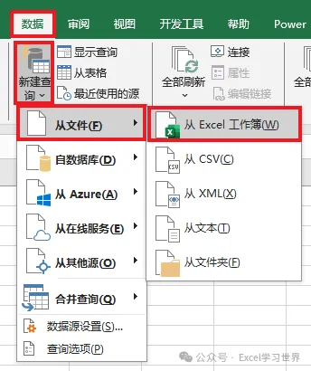 1. 选择工具栏的“数据”-->“新建查询”-->“从文件”-->“从 Excel 工作簿”