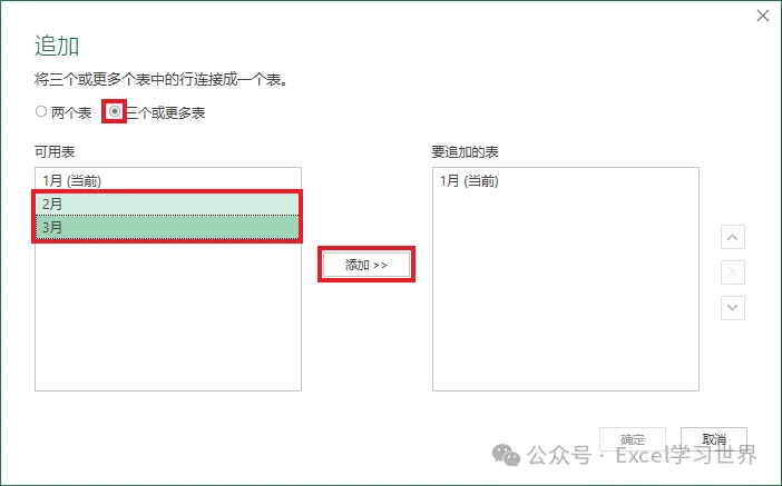 4. 在弹出的对话框中选择“三个或更多表”--> 选中“2月”和“3月”--> 点击“添加”按钮