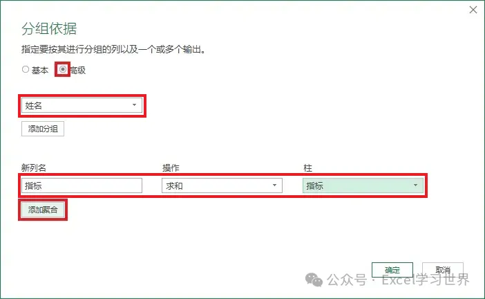 7. 在弹出的对话框中按以下方式设置 --> 点击“添加聚合”按钮: