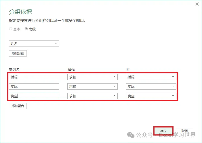 8. 在新的聚合中分别对“实际”和“奖金”求和 --> 点击“确定”