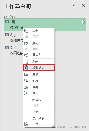 12. 在右侧的“工作簿查询”区域选中“1月”--> 右键单击 --> 在弹出的菜单中选择“加载到”
