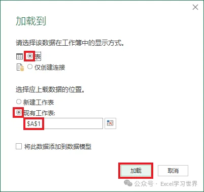 13. 在弹出的对话框中选择“表”--> 选择“现有工作表”及所需上传至的位置 --> 点击“加载”