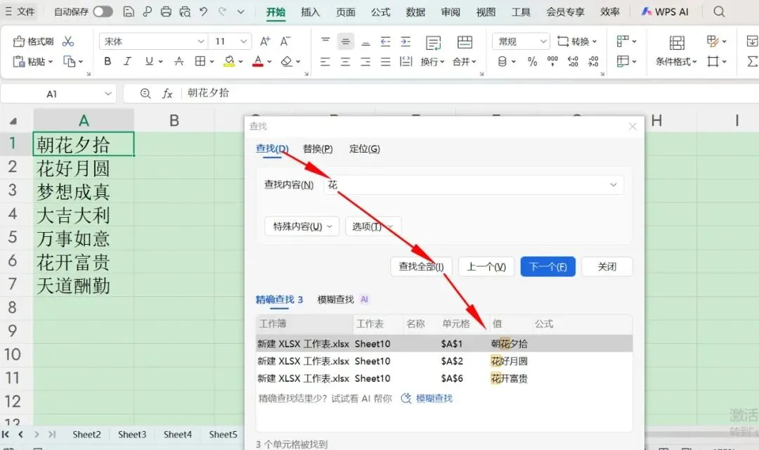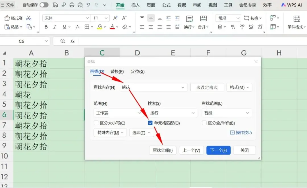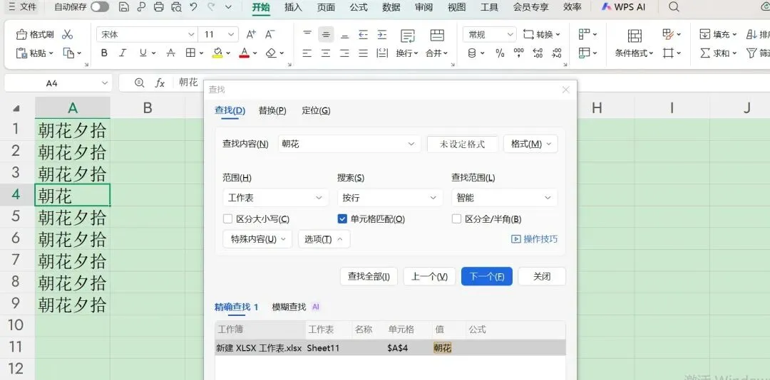 首先输入想要精确查找的内容,比如在下图中,精确查找“朝花”,则在“搜索”那一栏勾选“单元格匹配”,就能精确查找出来了。