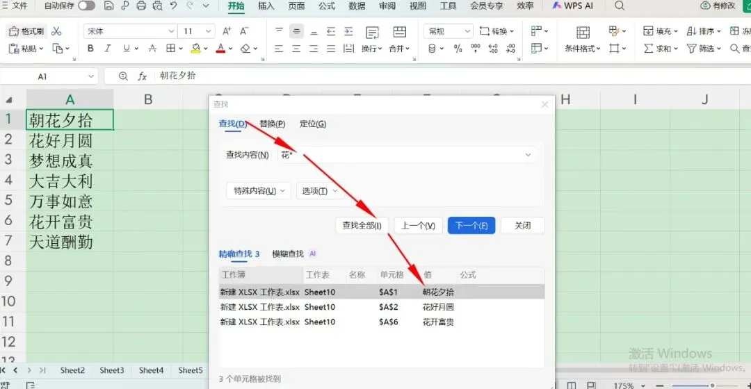 其实前面还学了一个方法,就是运用*这个通配符,可以代替任意多个字符,那么在这里,我们可以在“查找内容”处填写“花*”,则显示以下内容。