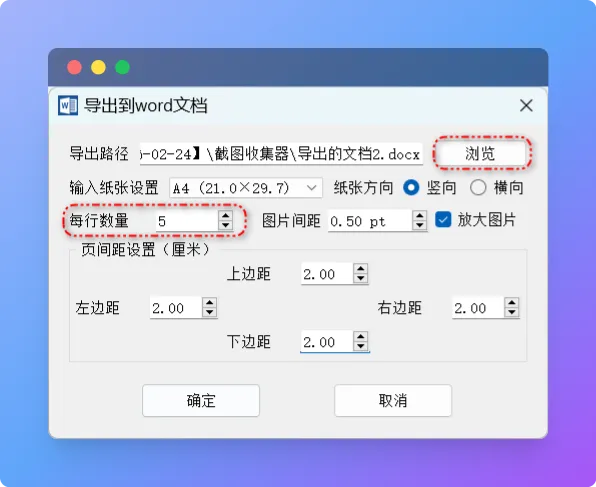 三、在弹出的对话框中,点击“浏览”,设定(新建)一个Word文档,接着设定每行放置几张图片。其他设置,大家可以根据自己的需要进行调整。四、点击“确定”后,软件打开文档所在文件夹,我们双击打开文档,就可以看见制作好的图片合集。图集使用Word别个排版,可以进行二次编辑,但目前只能显示图片,不能显示文件名,也无法根据预定的表格内容插入图片,这个多少有点遗憾。