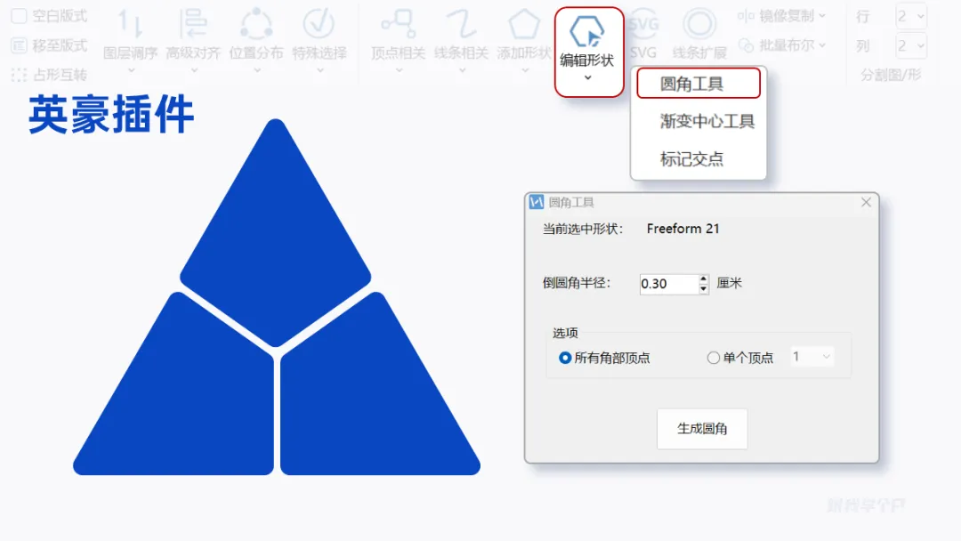 形状有些尖锐,可借助【英豪插件】的圆角功能让形状变得圆润一些: