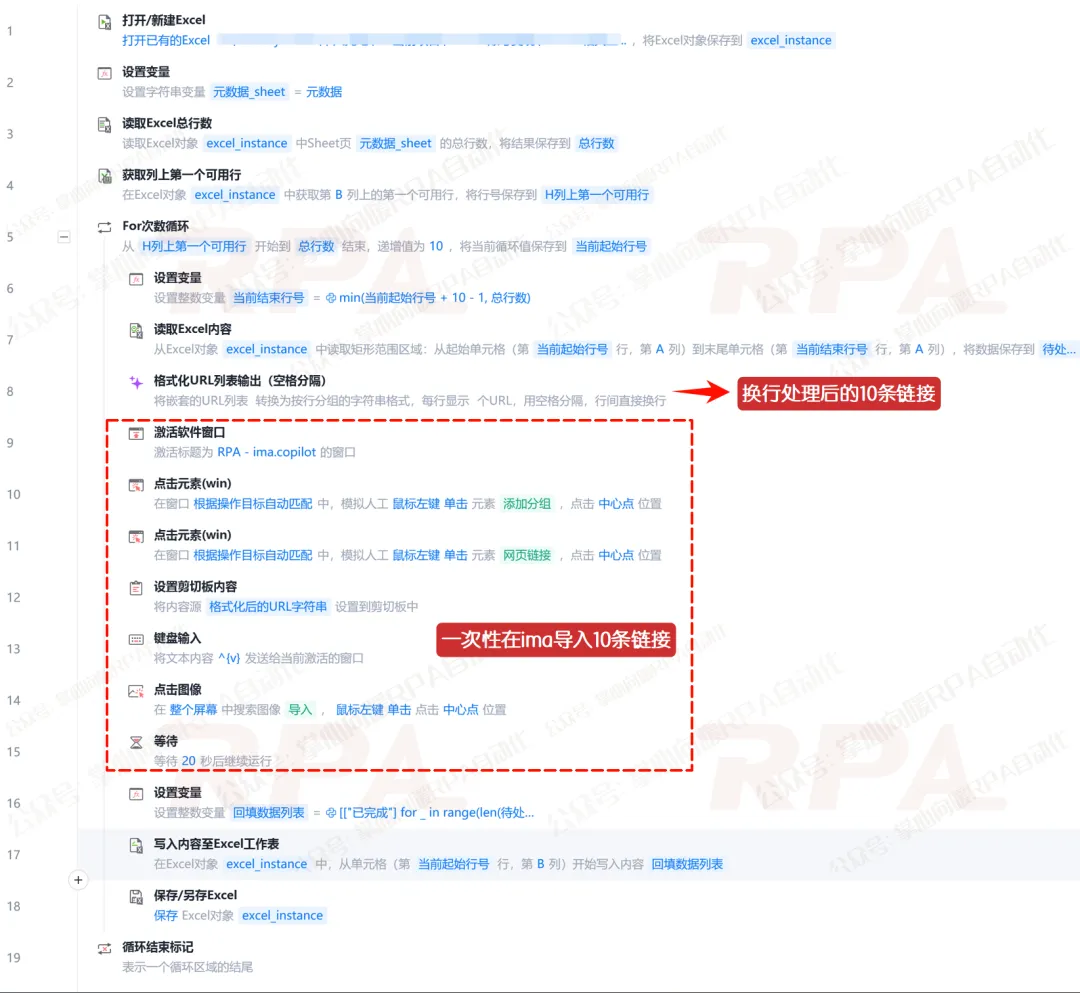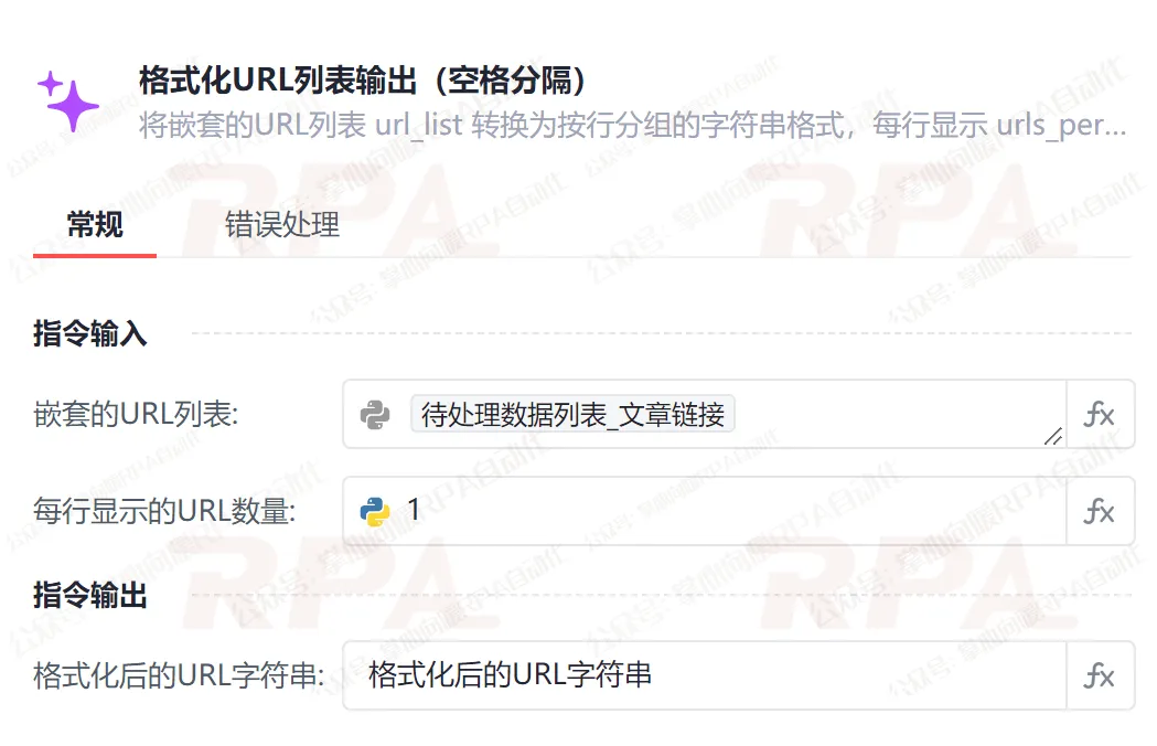 格式处理:现在,RPA机器人已经记住了这10条数据构成的二维列表。由于IMA导入链接要求链接换行,所以这里我们还需要将这10条数据构成的二维列表做格式处理。*推荐使用"魔法指令"一步到位。