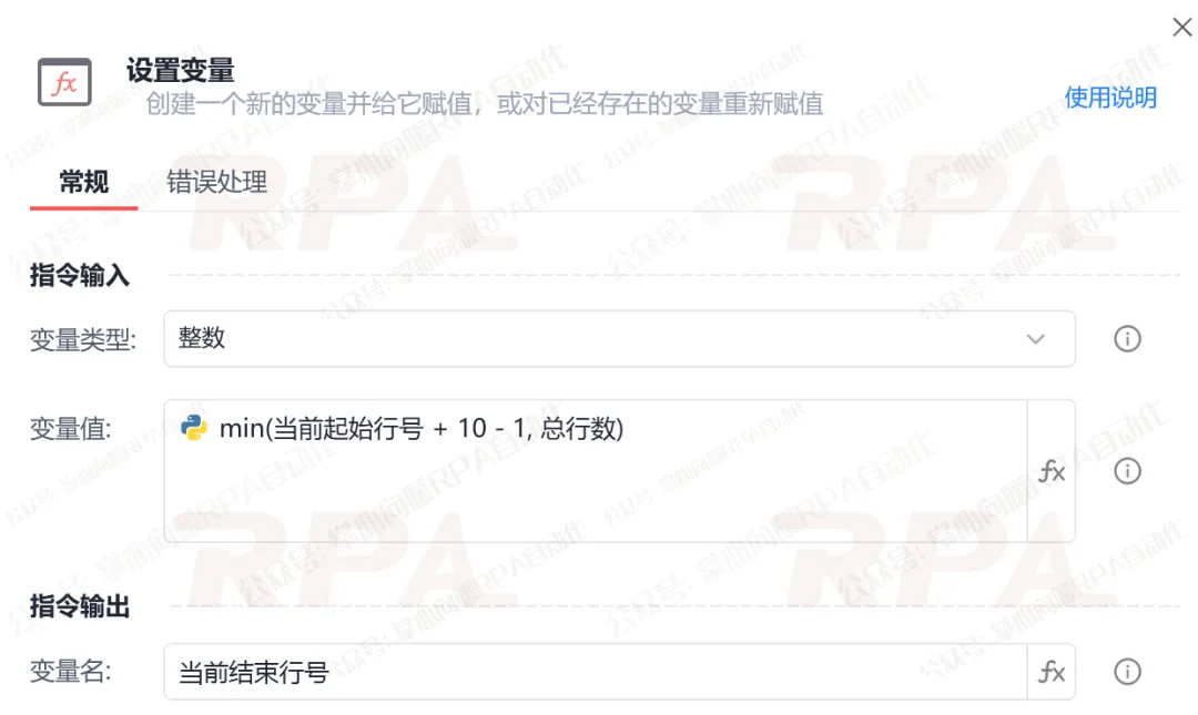 这里我们使用"设置变量"指令创建一个【当前结束行号】变量。点亮Python表达式模式,输入:min(当前起始行号 + 步长 - 1, 总行数)。