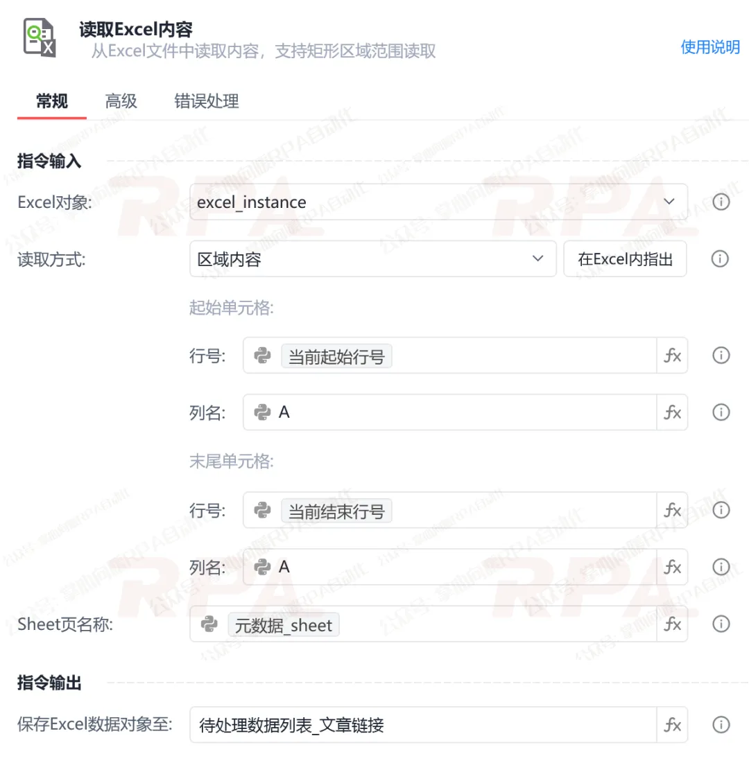执行读取:使用"读取Excel内容"指令,选择【区域内容】。起始单元格设为 "A"列 + 当前起始行号,结束单元格设为 "A"列 + 当前结束行号,将这 10 个数据存入【待处理数据列表】。