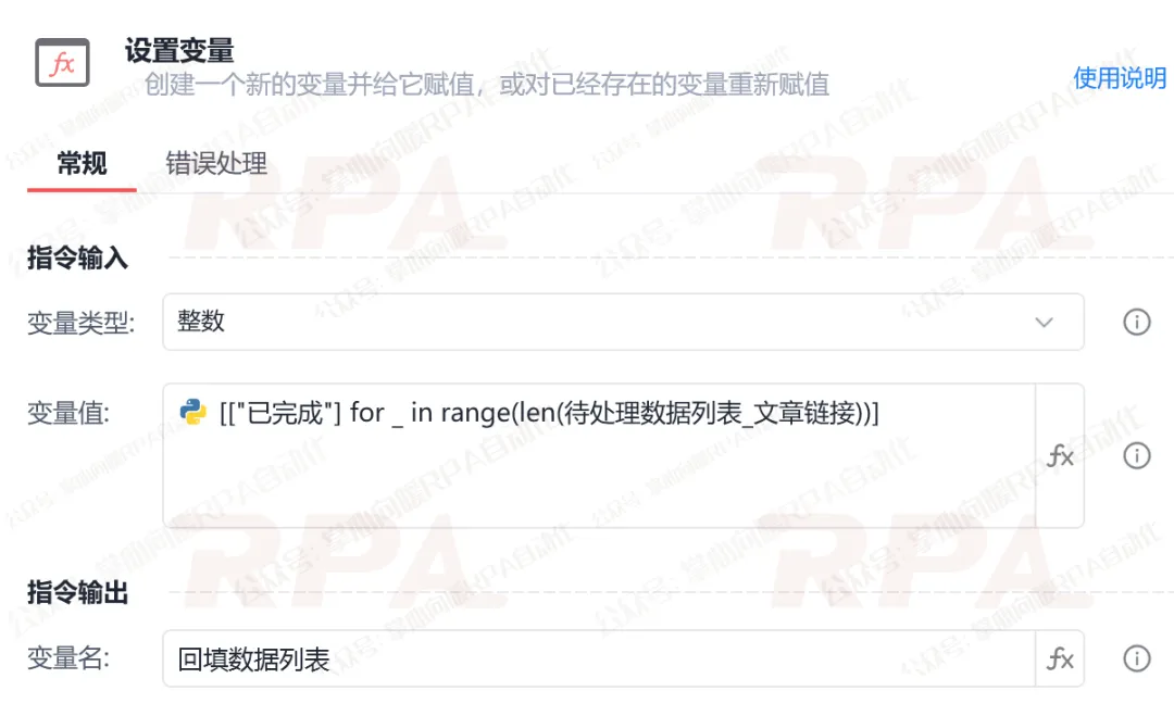 生成回填数据:使用“设置变量”创建一个【回填数据列表】,Python 表达式:[["已完成"] for _ in range(len(待处理数据列表))]。