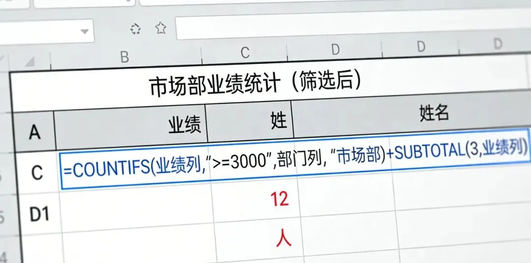 举个小例子:A 列是部门、B 列是业绩,筛选后只统计可见行里 “部门 = 市场部” 且 “业绩≥3000” 的人数,用这套组合公式,无论怎么筛选,计数永远准确,不用手动核对,效率直接拉满!