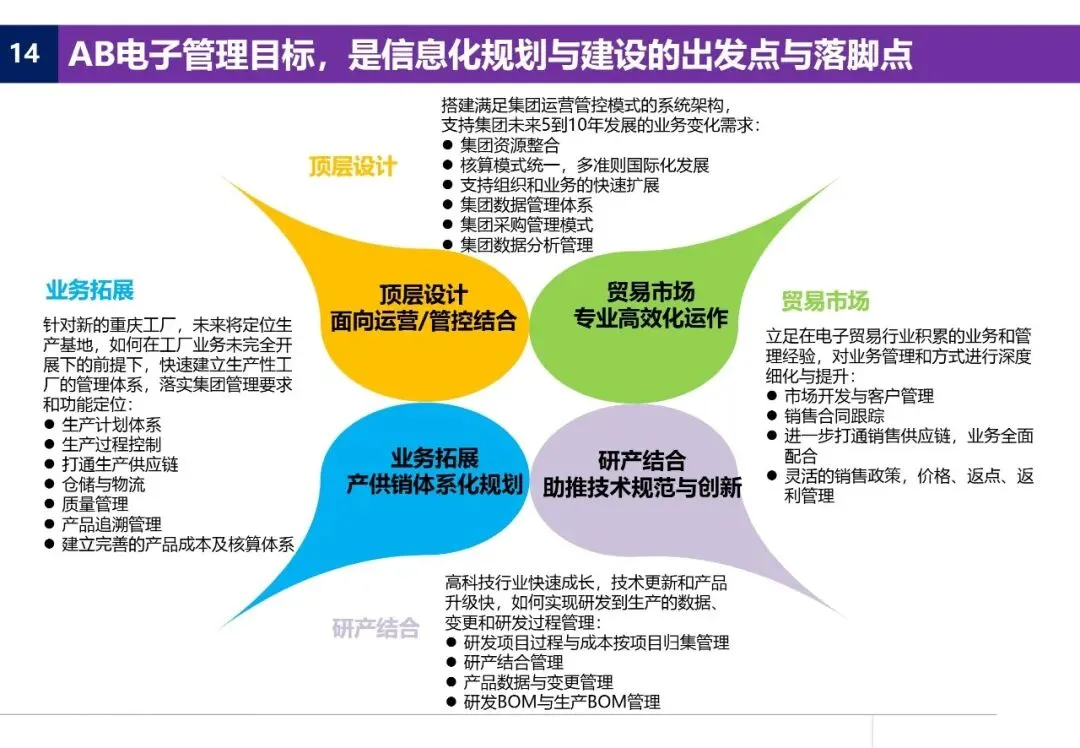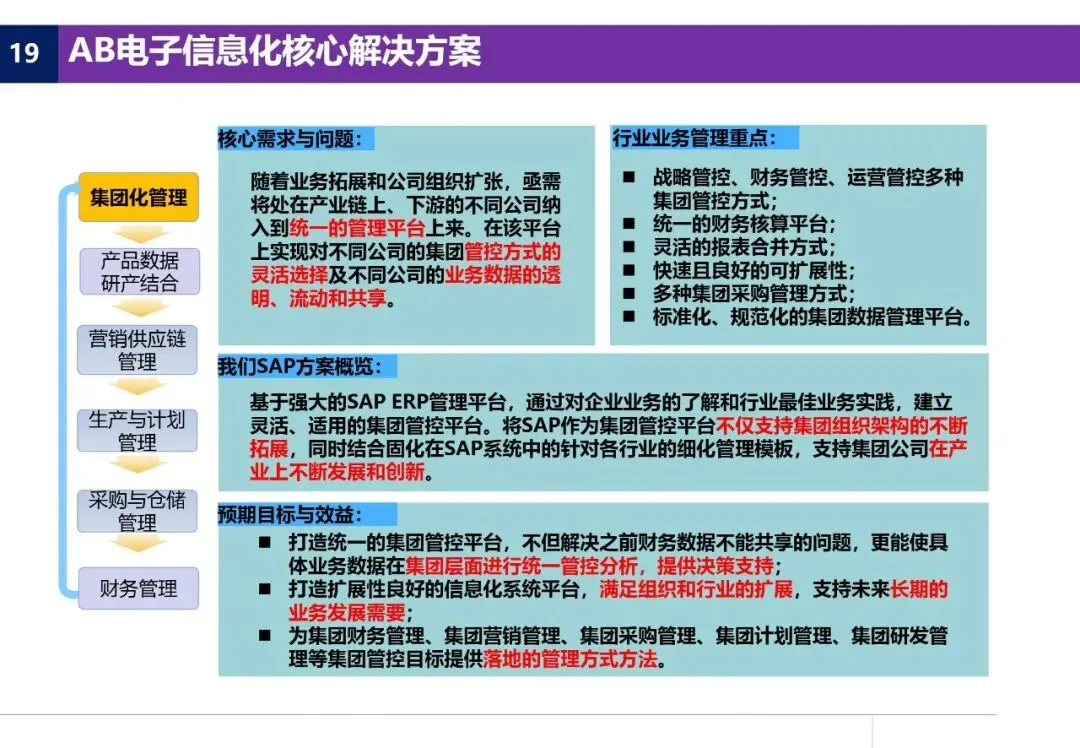 以某电子集团(文档中称为“AB电子”)为例,其业务涵盖山东的研产基地、重庆的电力公司以及新加坡的贸易窗口。SAP通过灵活的架构设计,能够同时支持战略管控、财务管控和运营管控等多种模式。它能实现多法人、跨区域的业务与财务整合,解决内部交易结算、数据孤岛等难题,为集团资源整合与未来快速扩张打下基础。