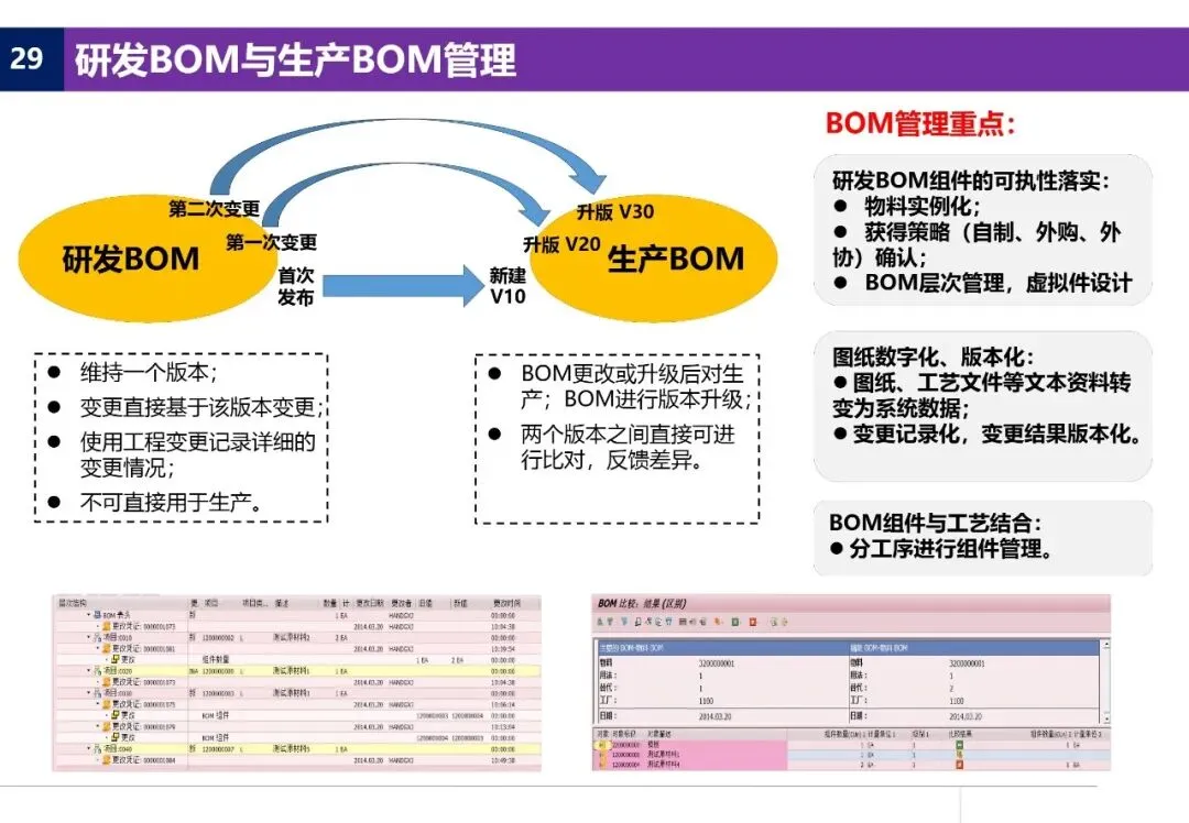 一体化产品数据管理:通过建立统一的物料编码与描述规则,实现“一物一码”,为整个供应链的高效运作奠定基础。SAP支持研发BOM(Bill of Material)向生产BOM的规范转换与版本管理,并通过工程变更管理(ECM)严格控制变更流程,确保数据的准确性与可追溯性。