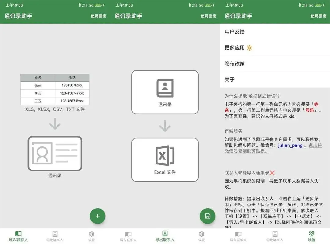 这款通讯录助手可以快速的将excel联系人导入到手机通讯录中。也可将手机联系人导出到excel通讯录,还可将excel联系人发送到qq或微信进行导入,真正的做到通讯录资源共享,支持根据导入的前缀一键删除导入的号码。拥有此qq/微信通讯录同步助手再也不用怕号码丢失。