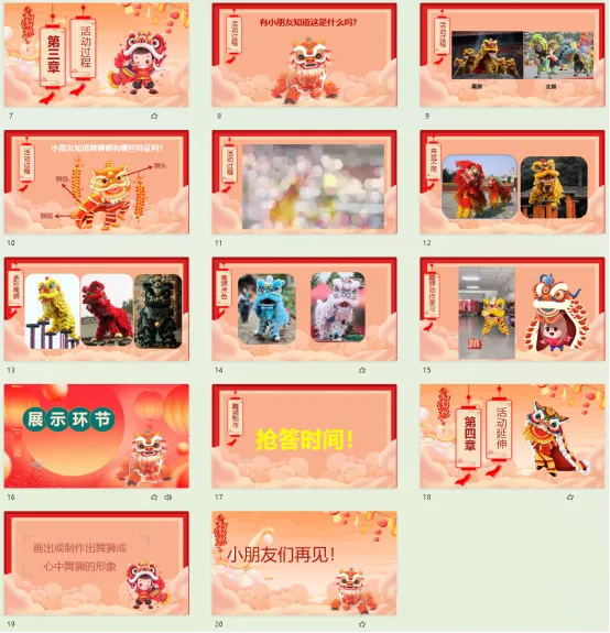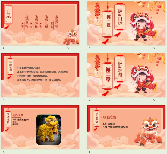 1.物质准备:PPT(视频和图片),音乐,舞狮服装。