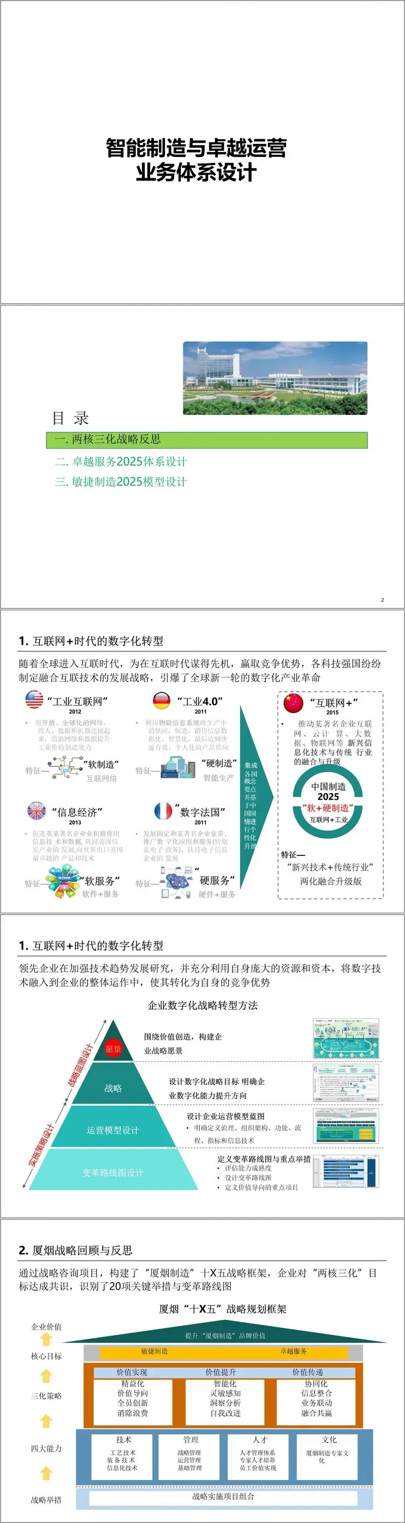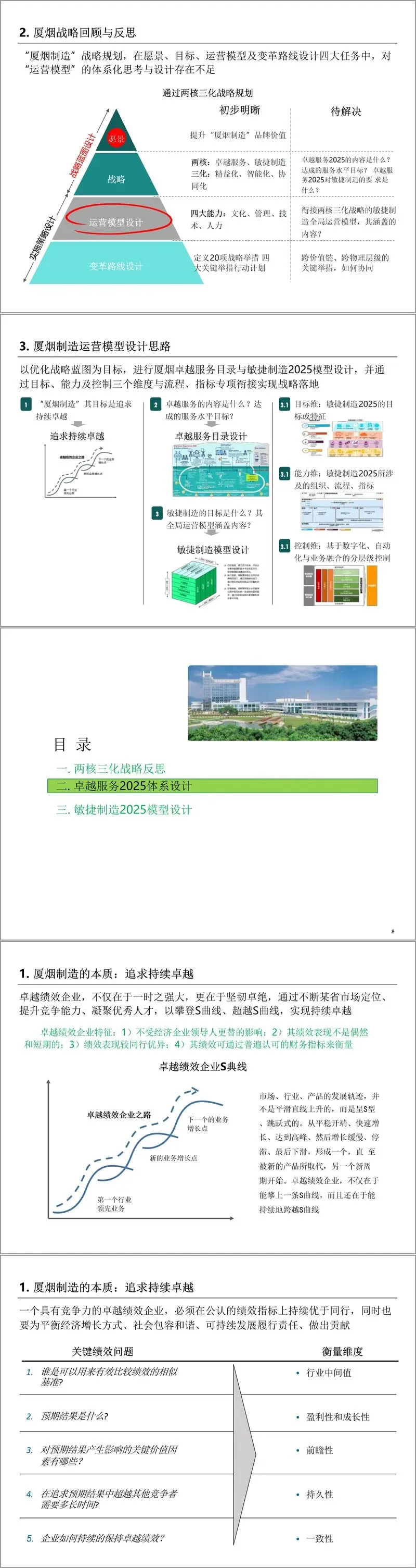 该体系先对 “两核三化” 战略进行复盘,厦烟虽已构建 “十 X 五” 战略框架,明确 “卓越服务、敏捷制造” 双核心与 “精益化、智能化、协同化” 三策略,以及文化、管理、技术、人力四大能力,但在运营模型的体系化思考与设计上存在不足,亟待明确卓越服务 2025 的具体内容、服务水平目标,以及敏捷制造全局运营模型等关键问题。
