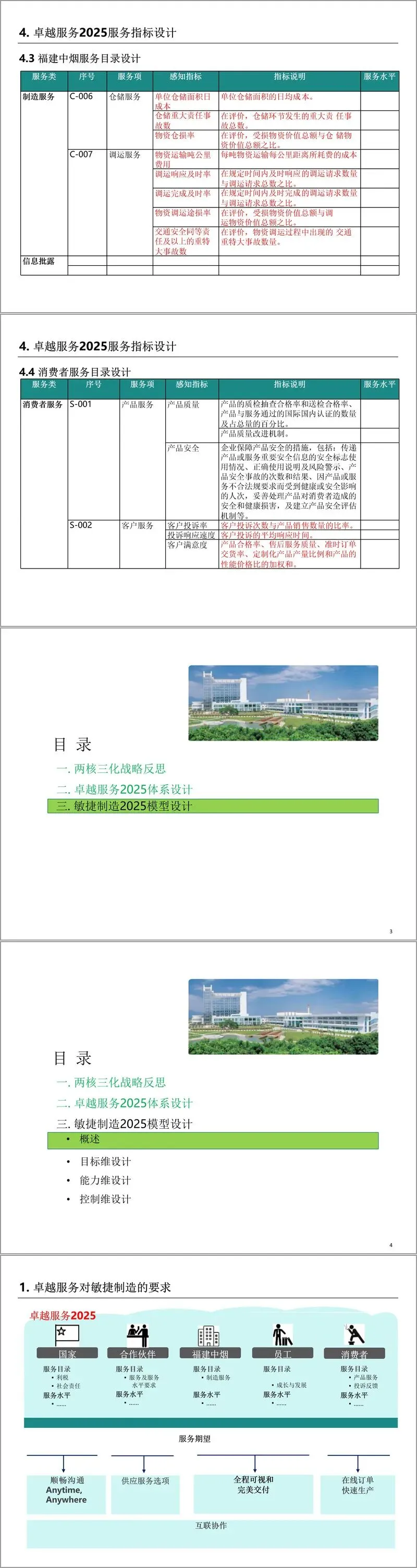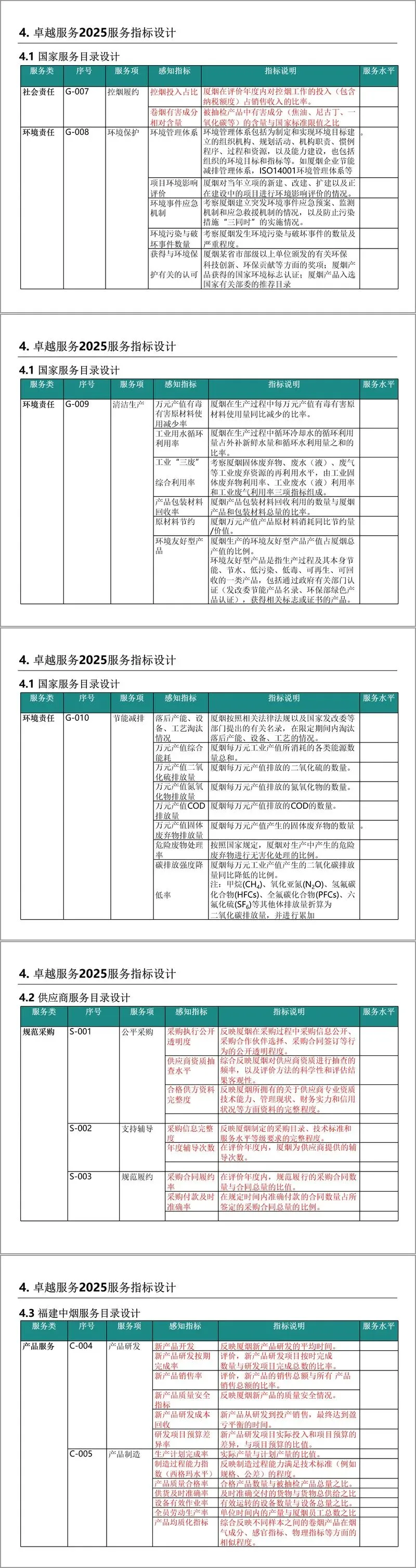 卓越服务 2025 体系围绕国家、供应商、福建中烟、消费者等五大利益相关方,以 “客户感知” 为核心,通过服务对象识别、服务目录设计、感知指标设计、服务水平定义四步骤构建。服务目录涵盖经济责任、社会责任、环境责任等多个服务类,每个服务类下细分具体服务项,如国家层面的依法纳税、安全生产,供应商层面的公平采购、规范履约等。同时,针对各服务项设计了科学的感知指标与指标说明,为服务水平的界定提供依据。