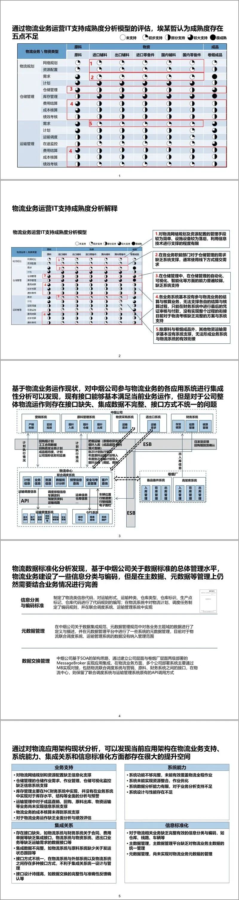 项目组基于物流中心职能定位与业务流程梳理,遵循埃某哲 IT 规划方法论,通过现状分析、蓝图设计、实施计划三大阶段,系统性推进物流信息化建设。现状诊断环节从业务支持度、系统集成度、数据标准化等维度切入,发现现有架构存在功能覆盖不全、资源整合不足、数据共享欠缺等问题,如物流网络规划缺乏信息化支撑、仓储管理自动化水平低、运输资源优化空间大等。