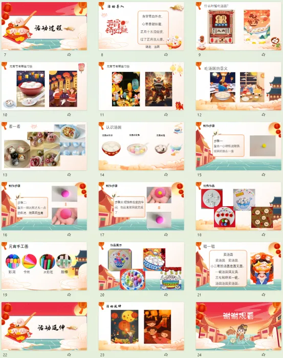 2.能够学会用捏、团、压等手法制作汤圆,能够尝试大胆创作元宵手工画