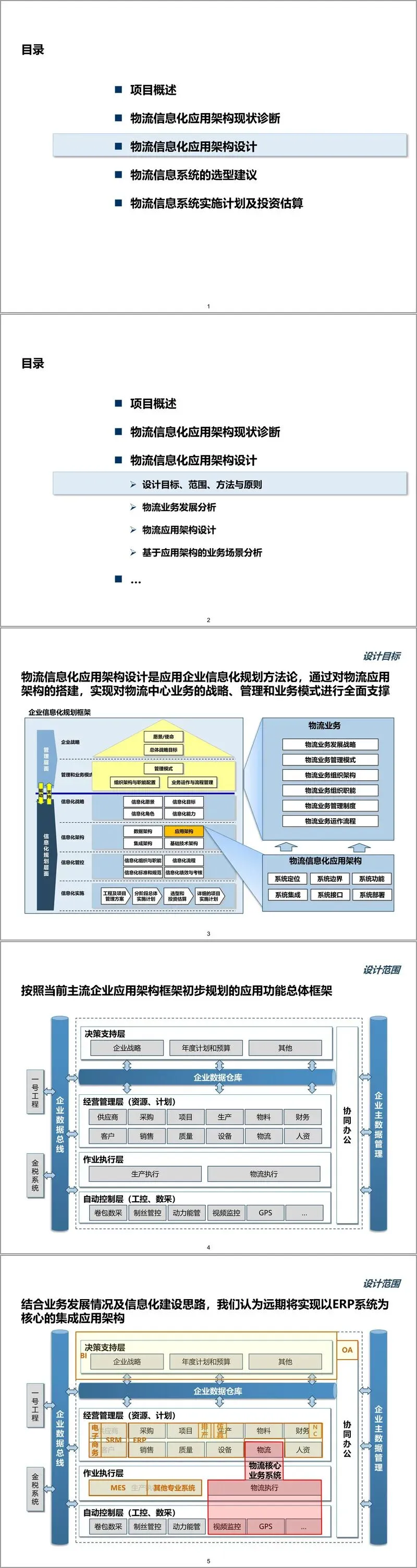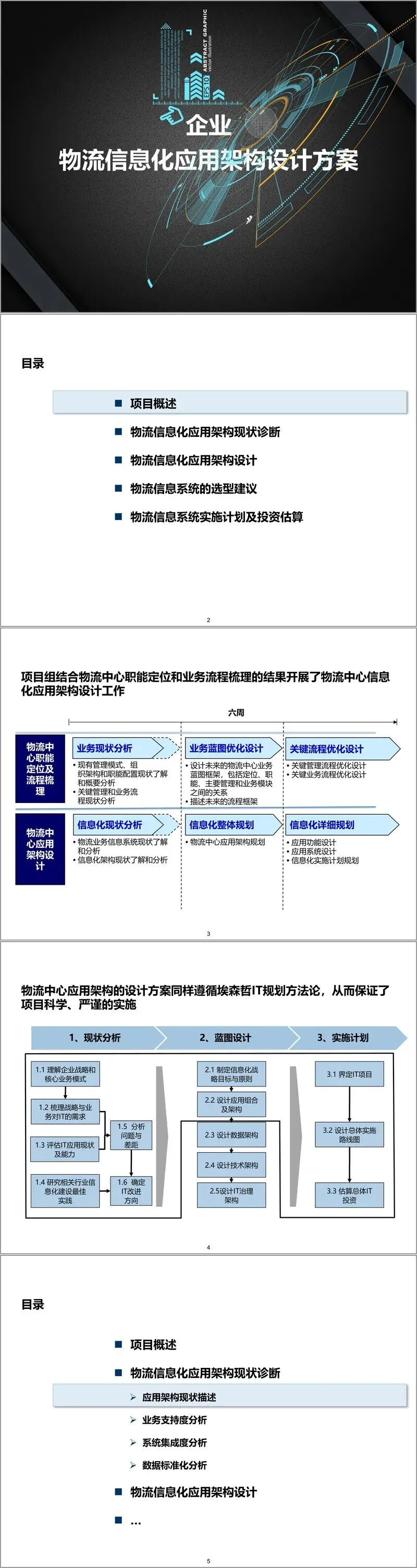 本方案围绕企业物流信息化建设展开全面规划,遵循埃森哲 IT 规划方法论,涵盖项目概述、现状诊断、架构设计、系统选型、实施计划及投资估算等核心模块,旨在构建适配企业战略的物流信息化体系。