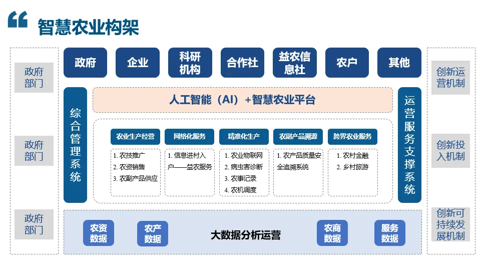 AI技术打通农业生产、加工、流通全链条数据孤岛。智能仓储系统通过计算机视觉实现农产品分级分选,自动化分拣效率提升5倍。需求预测算法分析消费端大数据,指导种植结构调整,减少结构性滞销。农业金融风控模型整合生产数据与信用评估,为农户提供无抵押信贷服务。知识图谱技术构建农业专家系统,将隐性经验转化为可复用的数字资产,赋能新型职业农民培育。最终形成数据驱动、产销融合、绿色高效的现代农业产业生态,推动农业从资源依赖型向技术密集型转变。