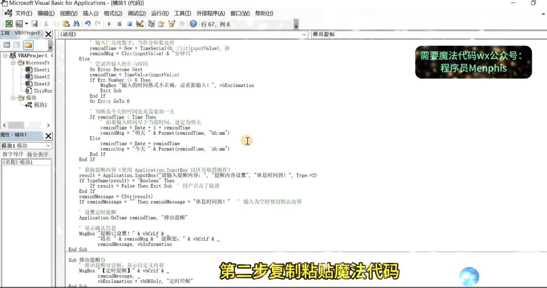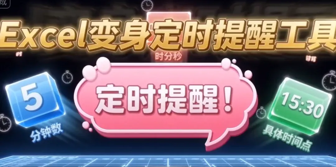 大家好,我是每天跟Excel打交道的办公族。最近一忙起来就忘了休息,经常在电脑前一坐就是三四个小时,眼睛酸、脖子疼。手机闹钟太容易忽略,番茄钟软件又得单独安装……于是我用Excel VBA写了个超简单的“定时提醒小工具”,可以自定义提醒时间和内容,到点自动弹窗!今天就把这个保姆级教程分享给你,按下面三个步骤,两分钟就能搞定~📌 功能效果