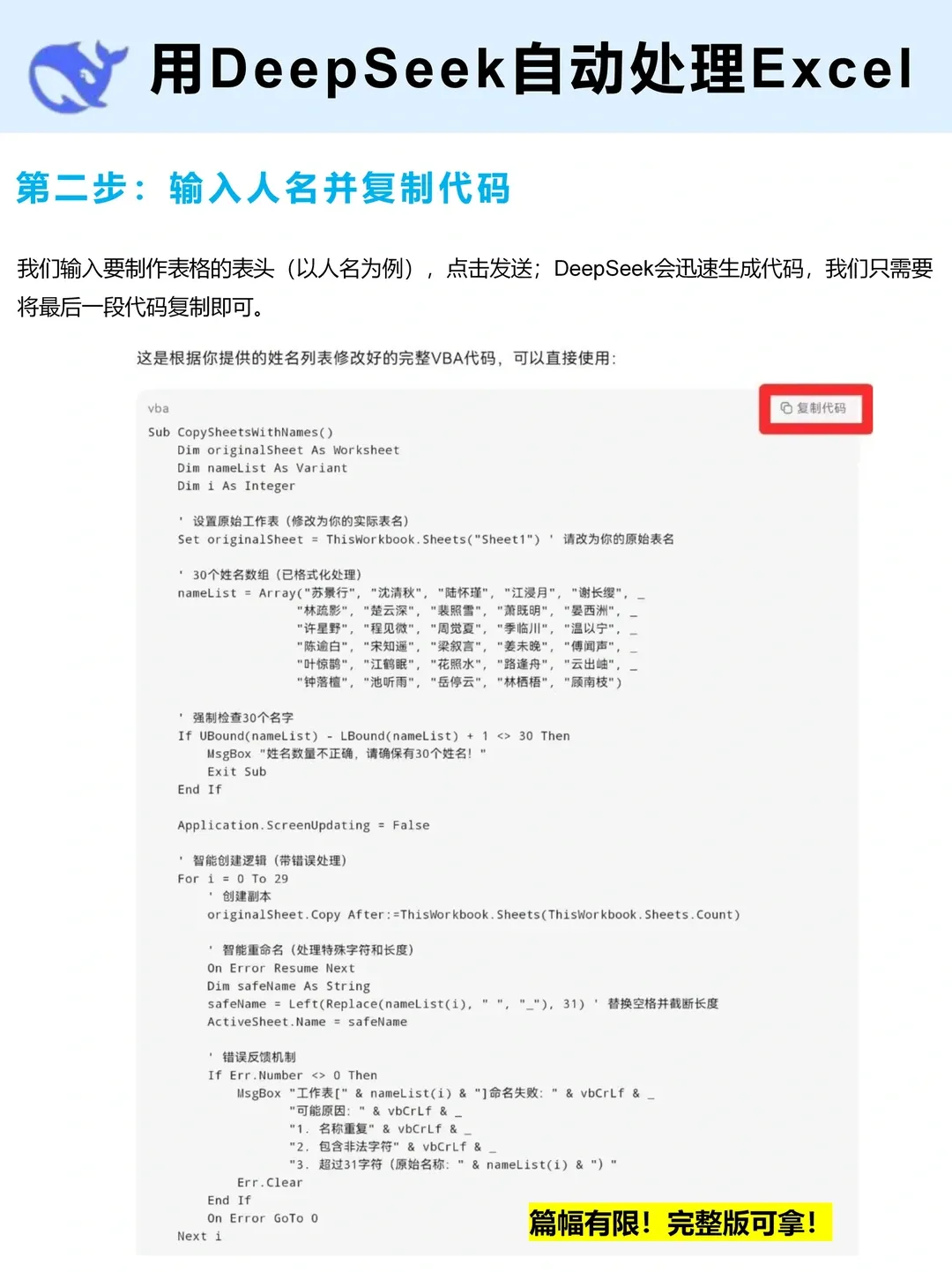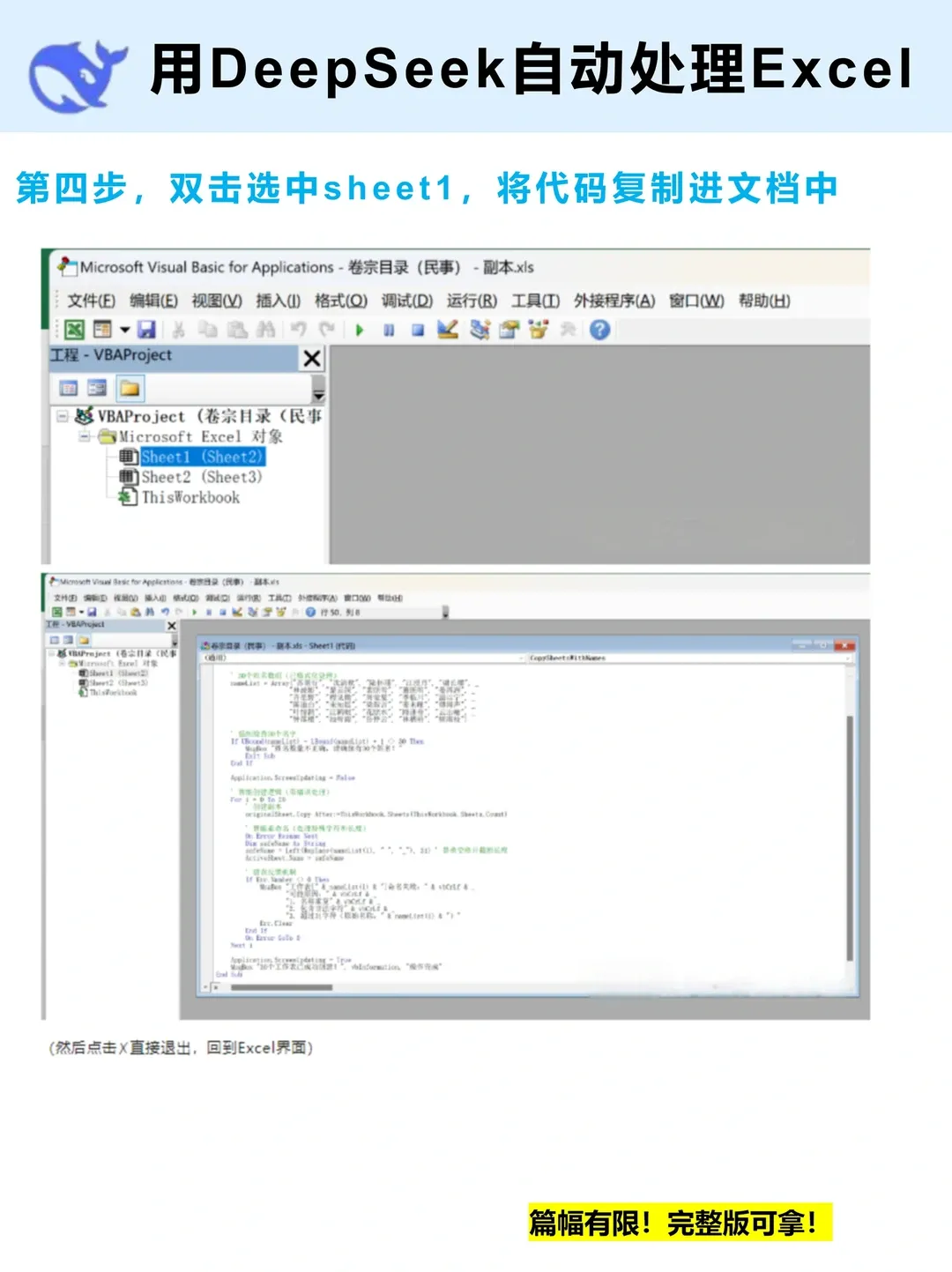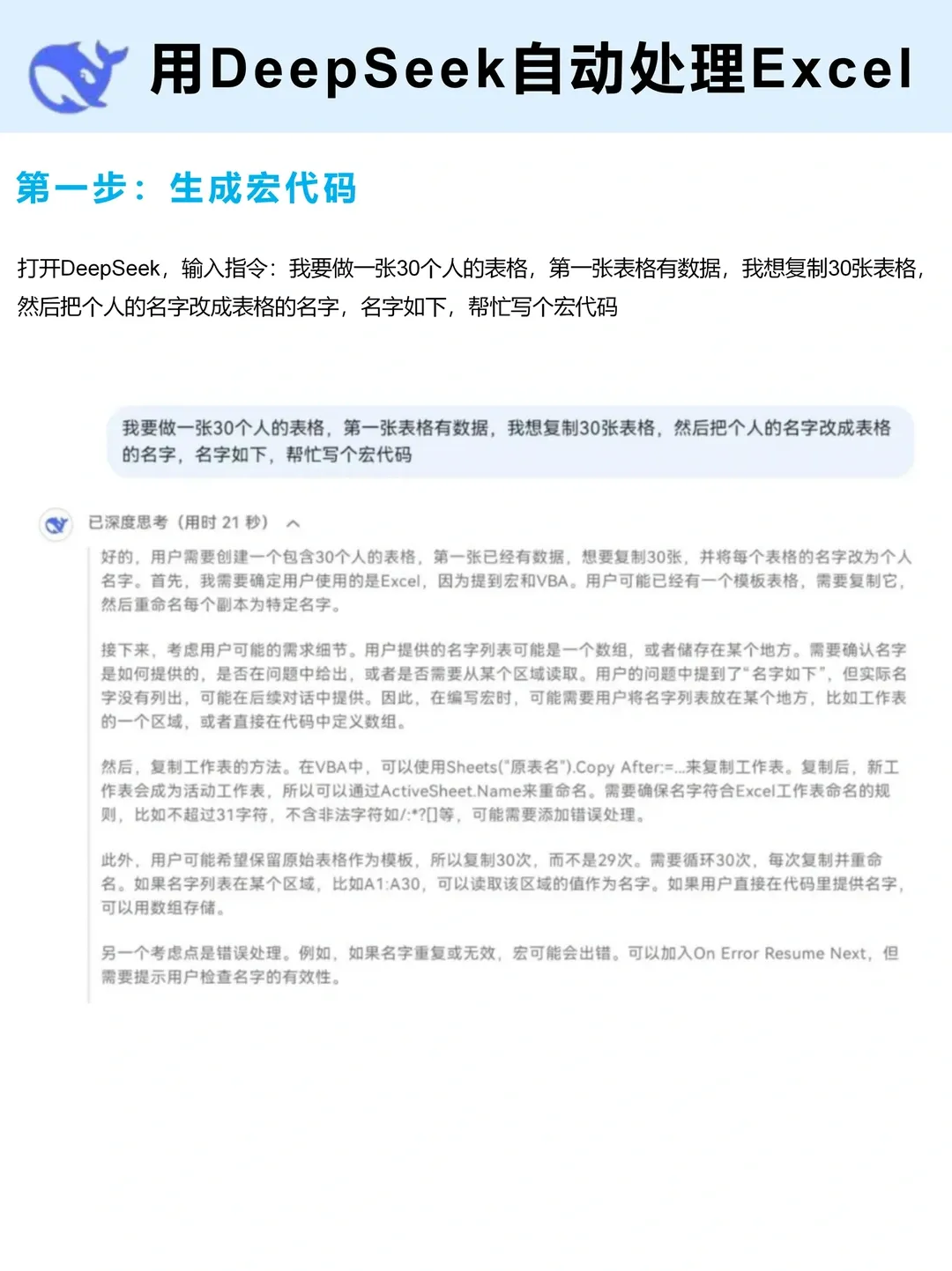 春节快过去了,想必大家应该也已经坐在办公室或者即将回到工位上了吧,工作任务又接踵而至,其中Excel的工作恐怕是少不了。尤其是需要做一堆几乎可以说是重复的Excel的时候,这时候更是让我们头大…… 有时想借助AI来帮忙制作Excel,却又总觉得它难以精准理解我们的需求?为此,我精心整理了一套用AI批量制作Excel的方法,是经过我亲身测试、确实好用的方法。无论是用于工作还是生活,都能大幅提升效率,轻松帮你解决各种难题。 - 使用DeepSeek来辅助批量生成Excel表格,仅需五个步骤。就能帮大家解决多个Excel批量制作的问题,在这个单一点上,不再做重复劳动💪。 让大家制作Excel的效率和质量都能大幅提高,既省时间又省力气配套的视频教程、课件源码、学习笔记全都打包📦好啦!想高效上手的小伙伴赶紧后台发送 “888” 就能抱走!后续还会分享更多干货,千万别错过~篇幅有限,更多精彩文章都收据在知识库里了,后台回复(888)大家自行获取!